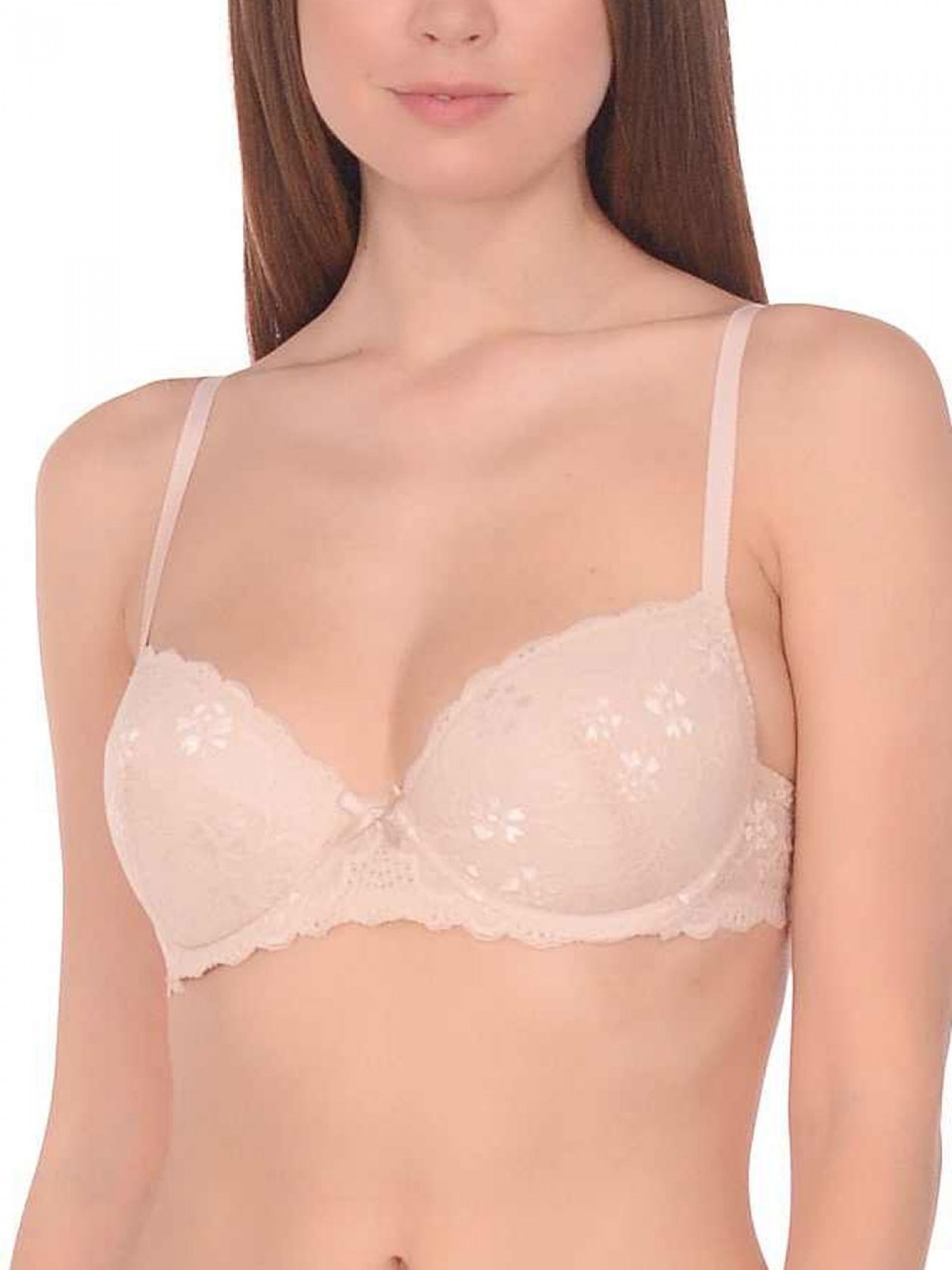 Бежевый бюстгальтер пуш-ап с треугольными чашками на поролоне. Чашки на каркасах, полотно из нежного кружева. Бретели тонкие, не съёмные.