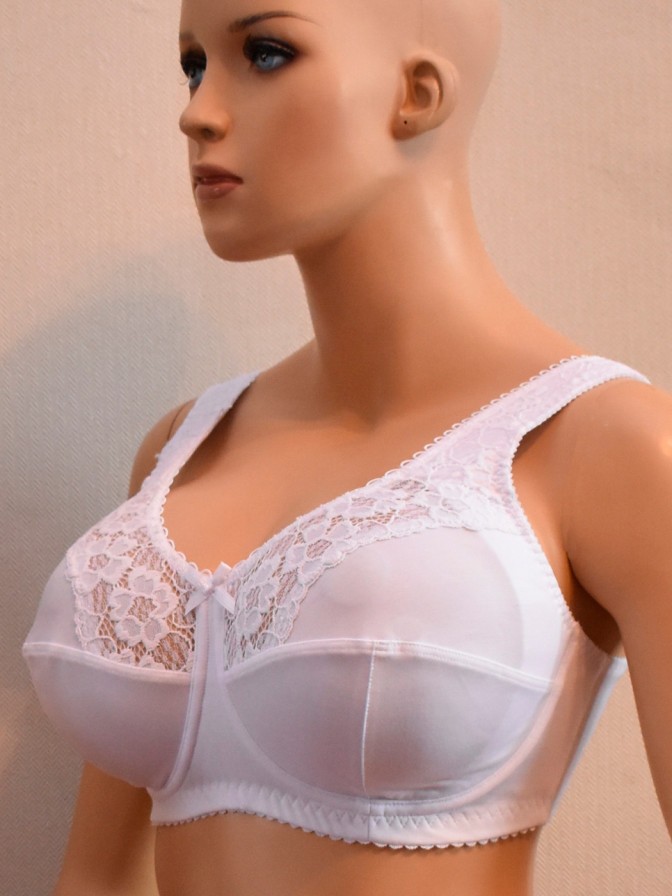 Бюстгальтер белого цвета, без косточек с широкими бретелями. Выполнен из эластичного кружева, эластичного трикотажного полотна. Нижние детали чашек на подкладке из хлопкового трикотажного полотна. Отделка эластичная тесьма с отделочным фестоном по краю и бантик. Закрытая форма бюстгальтера маячного типа надежно фиксирует грудь и поддерживает ее. Мягкая чашка и боковая корректирующая деталь, выполненная из поролона и переходящая в бретель деликатно поддерживают грудь, придавая ей элегантную форму. Расширенные спереди бретели снижают нагрузку на плечи, что создает дополнительный комфорт при носки данной модели бюстгальтера. Застежка в 3 ряда по 2-3 крючка в зависимости от размера.