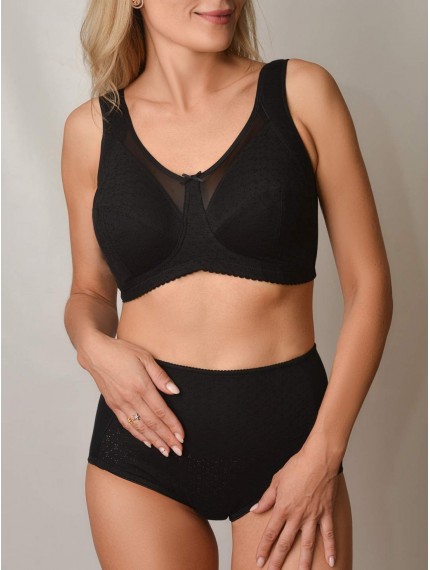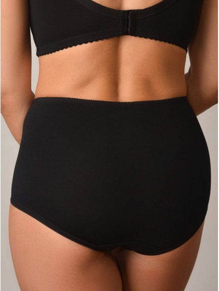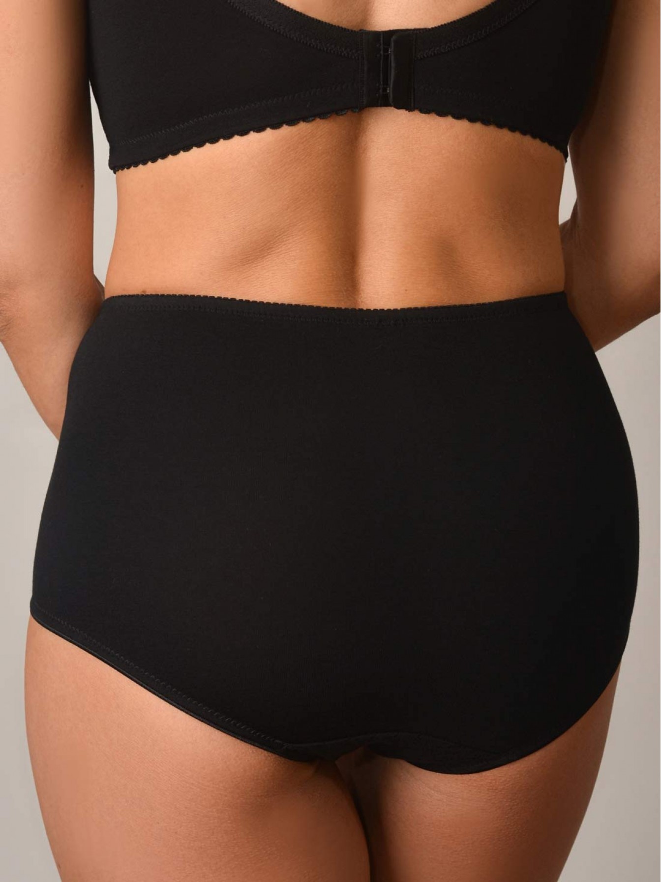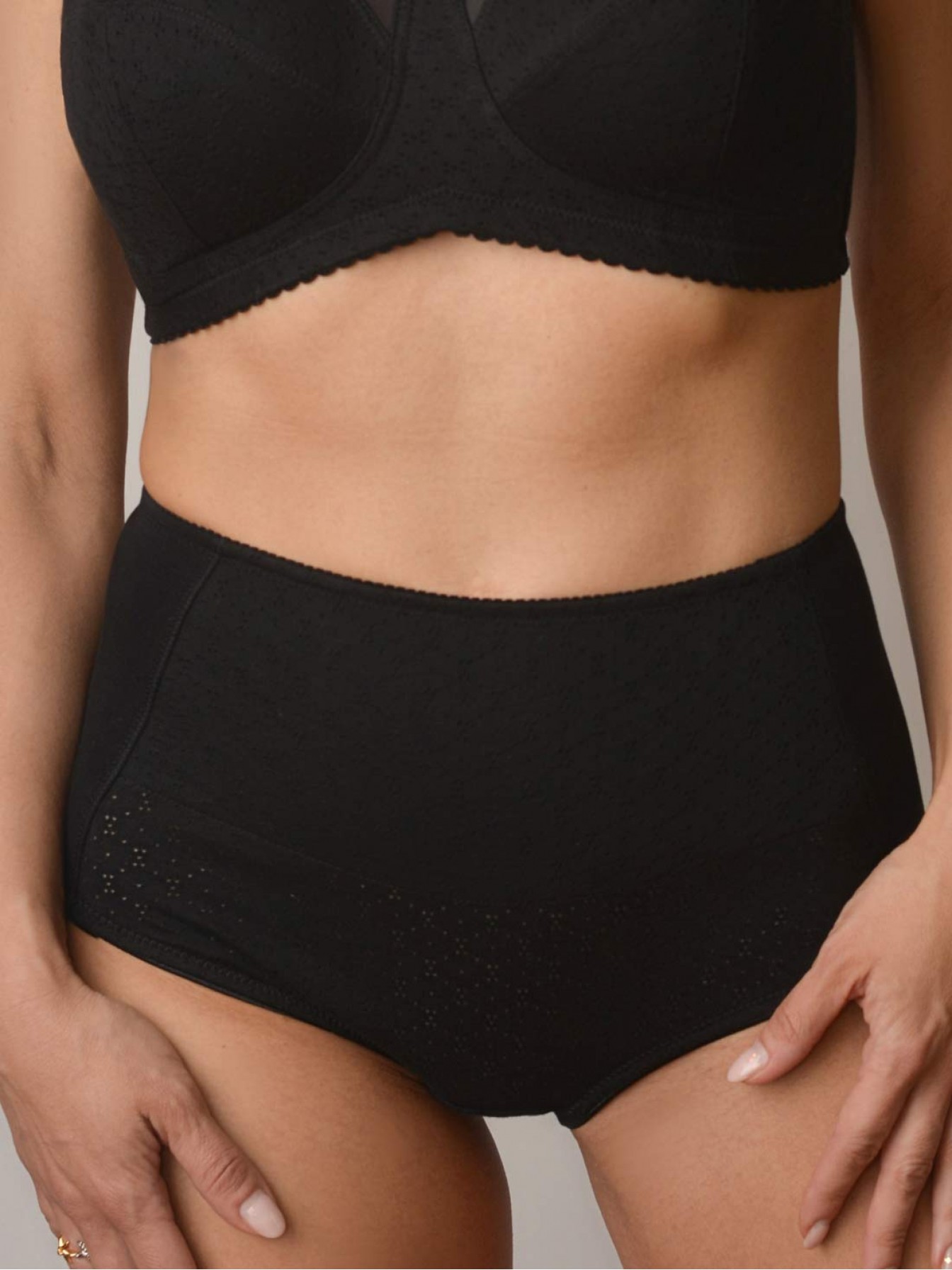 Женские трусы черного цвета с высокой линией талии из мягкого и натурального хлопка с мелкой перфорацией. Верхняя часть переда изделия с внутренней стороны дублирована хлопком, что обеспечивает легкую коррекцию зоны живота и максимальный комфорт. Отличный выбор для ценителей красоты и комфорта.