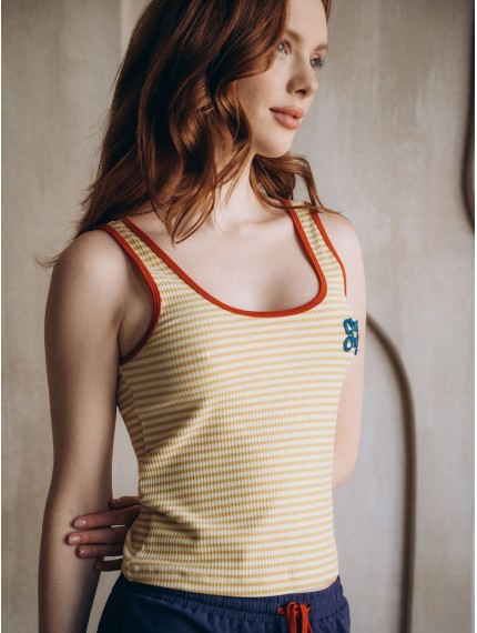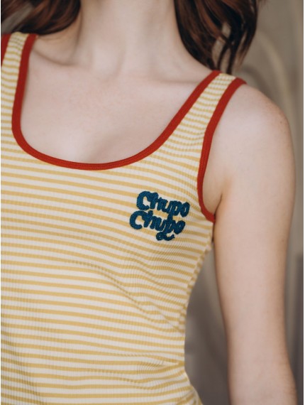 Домашняя пижама от торговой марки Indefini.В комплекте майка-топ и шорты.Майка из вискозы, желтого цвета, с принтом, в полоску, без рукавов, прилегающая.Шорты из хлопка, синего цвета, с принтом-нашивкой, прямые, прилегающие.