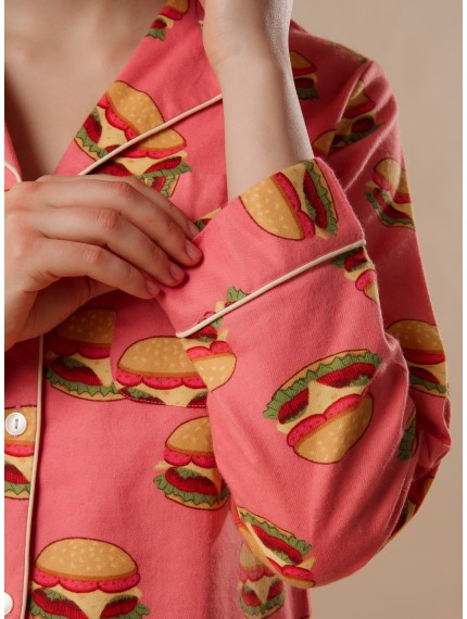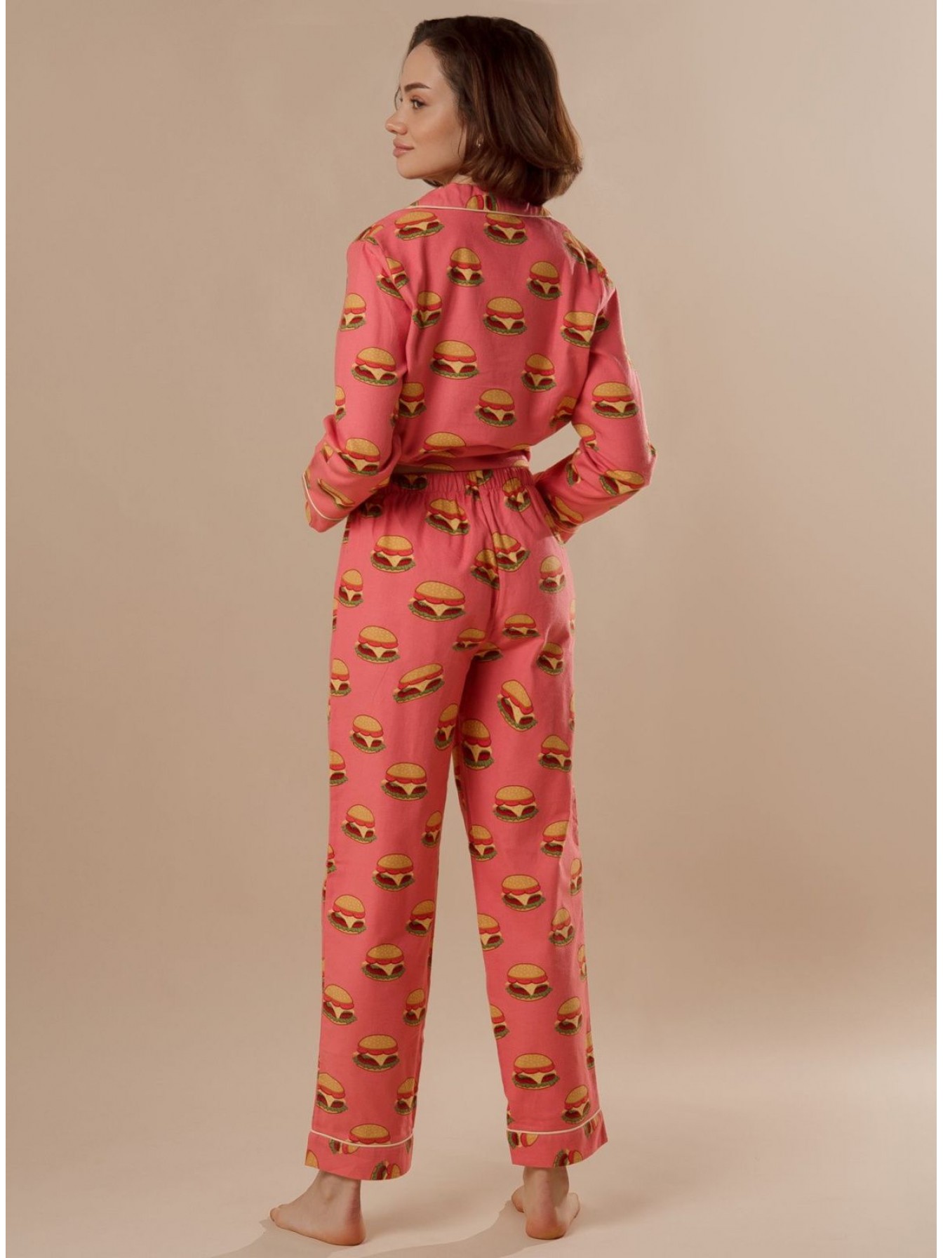Домашняя пижама от торговой марки Индефини. В комплекте рубашка и брюки. Рубашка из хлопка, оранжево-персикового цвета, с принтом, с длинными рукавами, с воротником-отворотом, с кармашком на груди, с обрамлением, на пуговичках, прямая, свободного кроя. Брюки из хлопка, оранжево-персикового цвета, с принтом, прямые, свободного кроя, с обрамлением, на мягкой резинке, с регулирующей лентой.