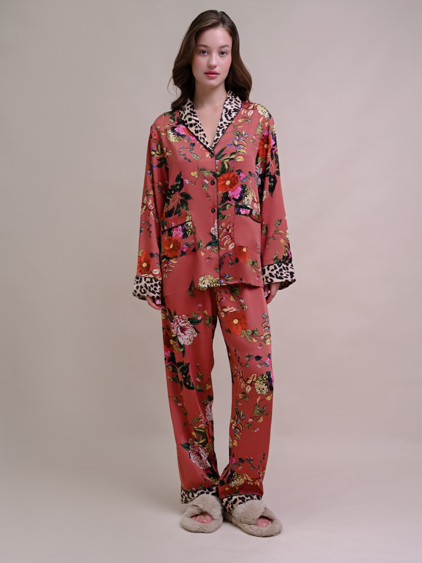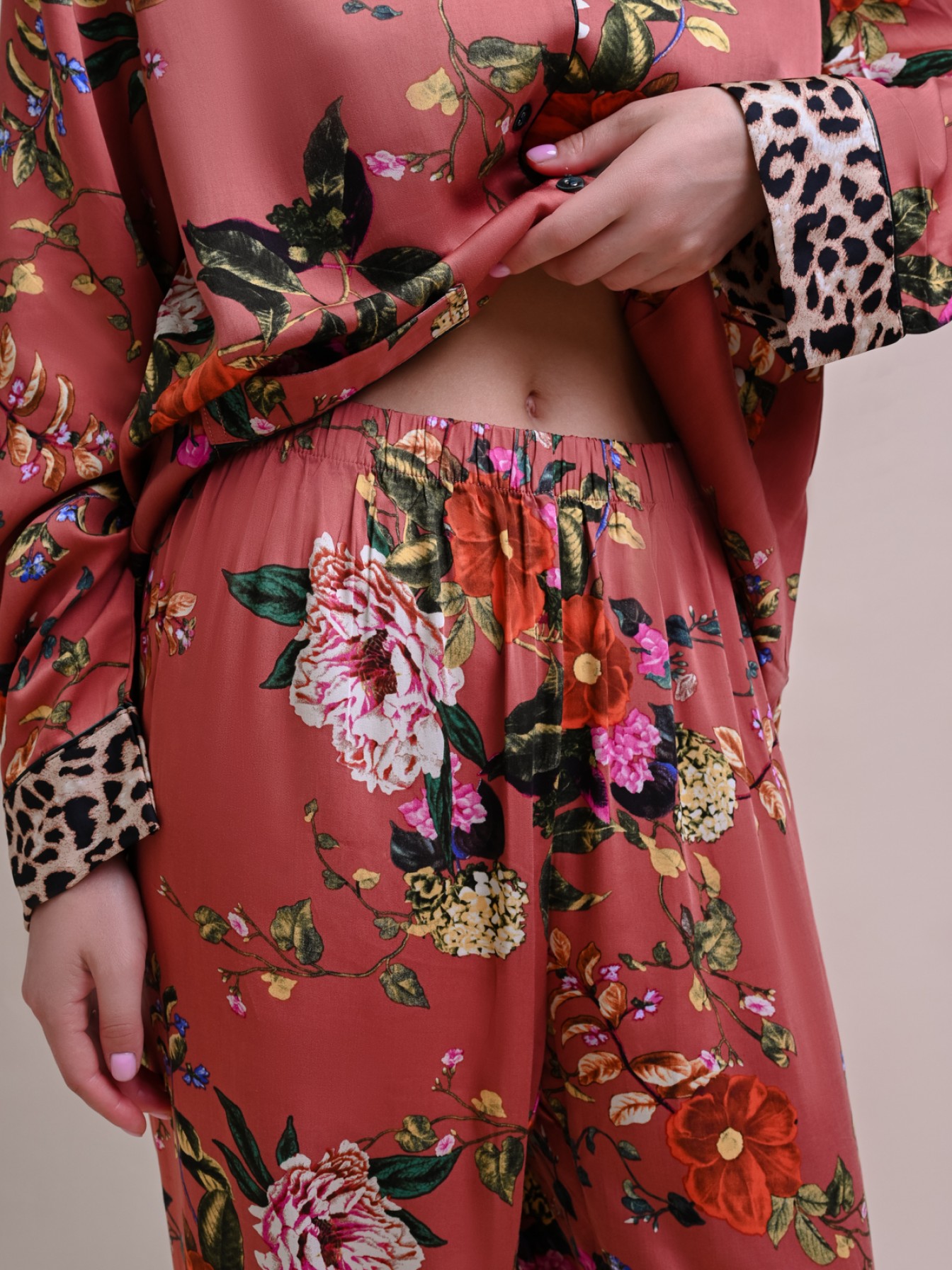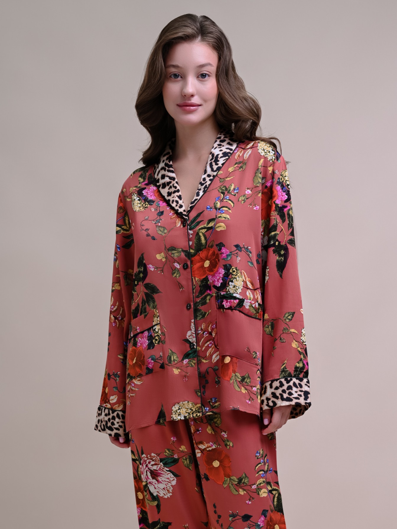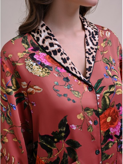 Домашняя пижама от торговой марки Индефини. В комплекте рубашка с брюками. Рубашка из вискозы, красно-коричневого цвета, с цветочным принтом, со вставками леопардового принта, с длинными рукавами, с воротником-отворотом, с кармашками по бокам, на пуговичках, прямая, свободного кроя. Брюки из вискозы, красно-коричневого цвета, с цветочным принтом, со вставками леопардового принта, на мягкой резинке, прямые, свободного кроя.