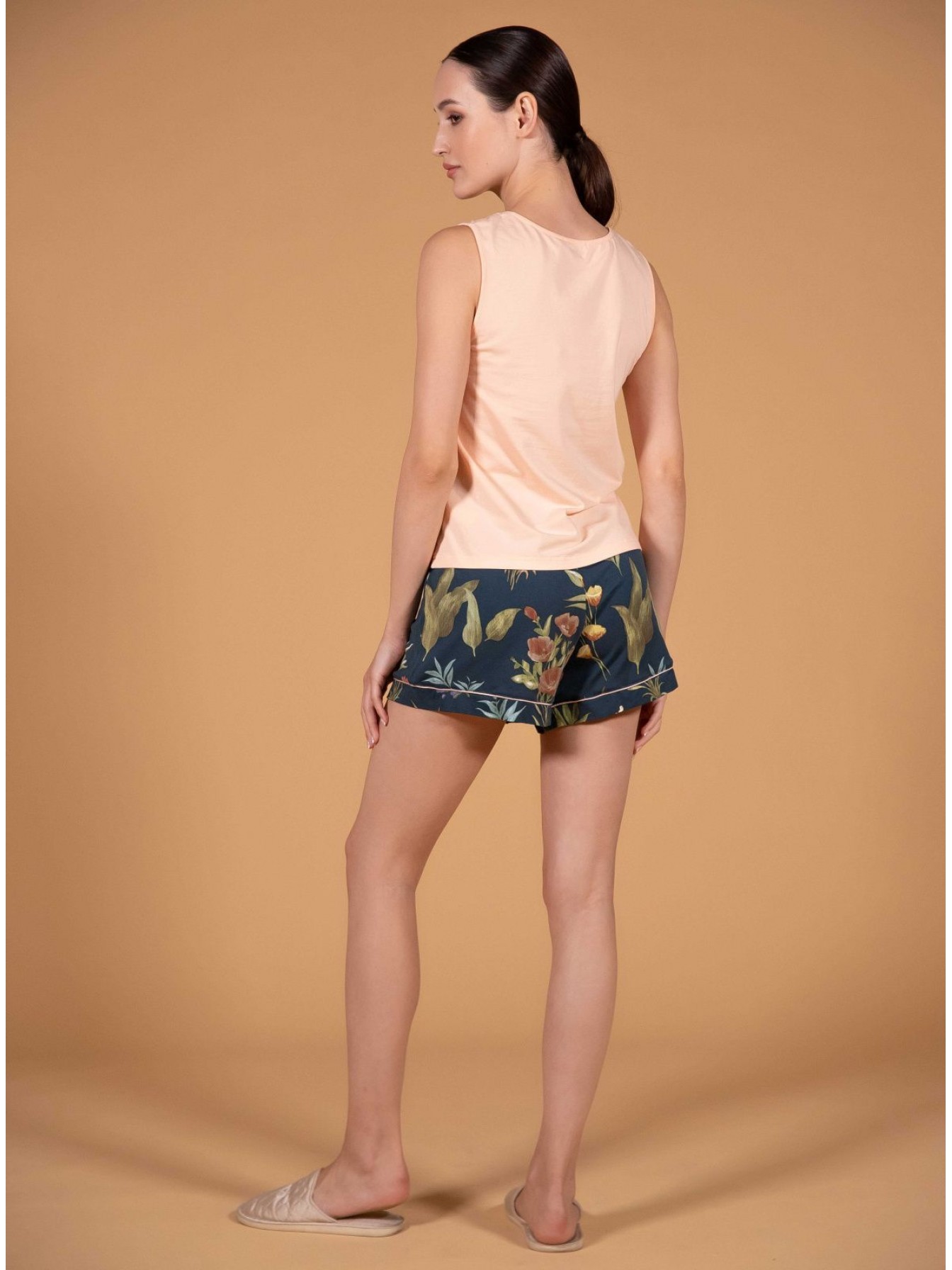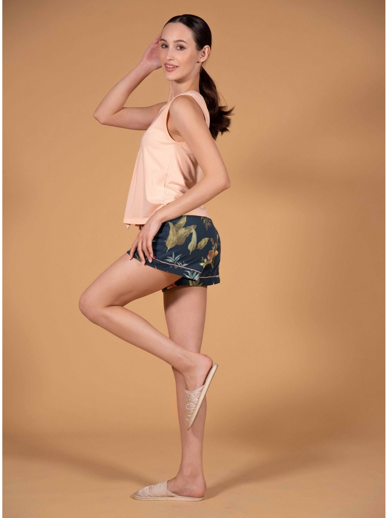 Домашняя пижама от торговой марки Indefini. В комплект входит майка-топ и шорты.Топ из бамбука и хлопка, персикового цвета, со вставкой из микросетки на груди, с кружевным обрамлением, без рукавов, прямая, свободного кроя.Шорты из бамбука и хлопка, сине-зеленого цвета, с цветочным принтом, с обрамлением, на мягкой резинке, с атласной регулирующей лентой.