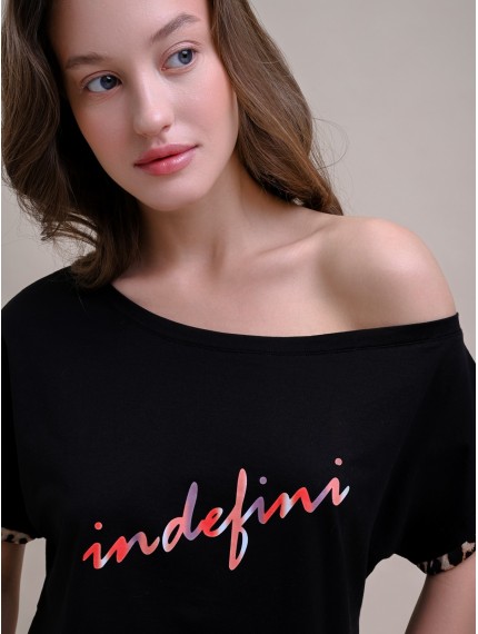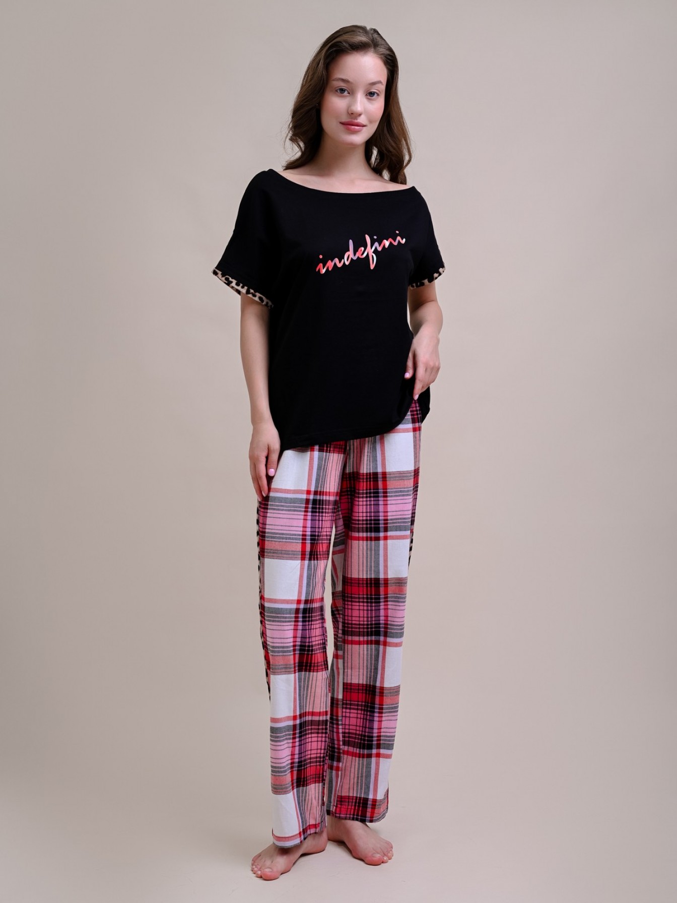 100% ХлопокДомашний костюм от торговой марки Indefini. В комплекте футболка с брюками.Футболка из хлопка, черного цвета, с принтом-надписью, на одно плечо, с короткими рукавами, с обрамлением, прямая, свободного кроя.Брюки из хлопка, бело-красного цвета, с принтом в клетку, со вставками по бокам, широкие, прямые, свободного кроя.