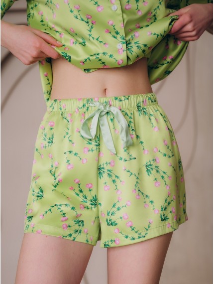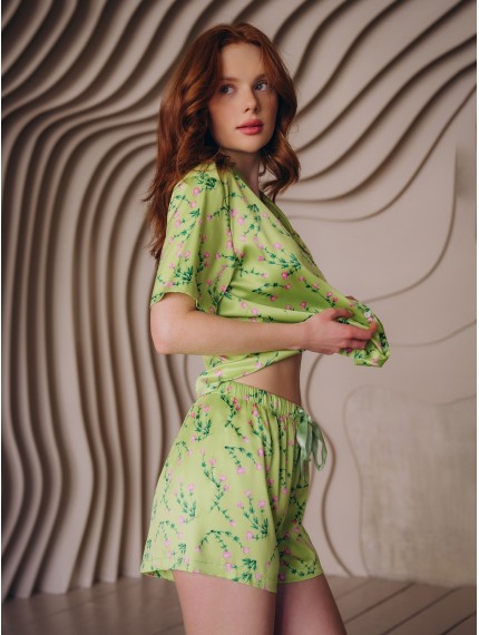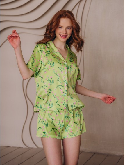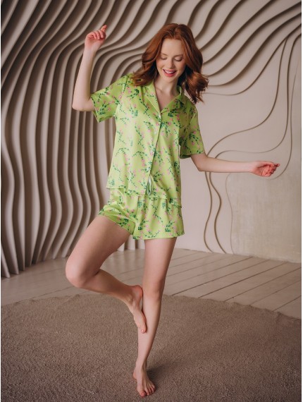 Пижама женская 3047TBD бренда Indefini, изготовленная из полиэстера, мягкая и гладкая на ощупь.В комплект входит футболка прямого свободного кроя с короткими рукавами, отложным воротником и пуговицами, что придаёт ей элегантный вид.Шорты свободного кроя на мягкой резинке с регулирующим атласным шнурком надежно сидят на талии.Пижама Indefini салатового цвета украшена нежным цветочным принтом, добавляя пижаме свежести и женственности.
