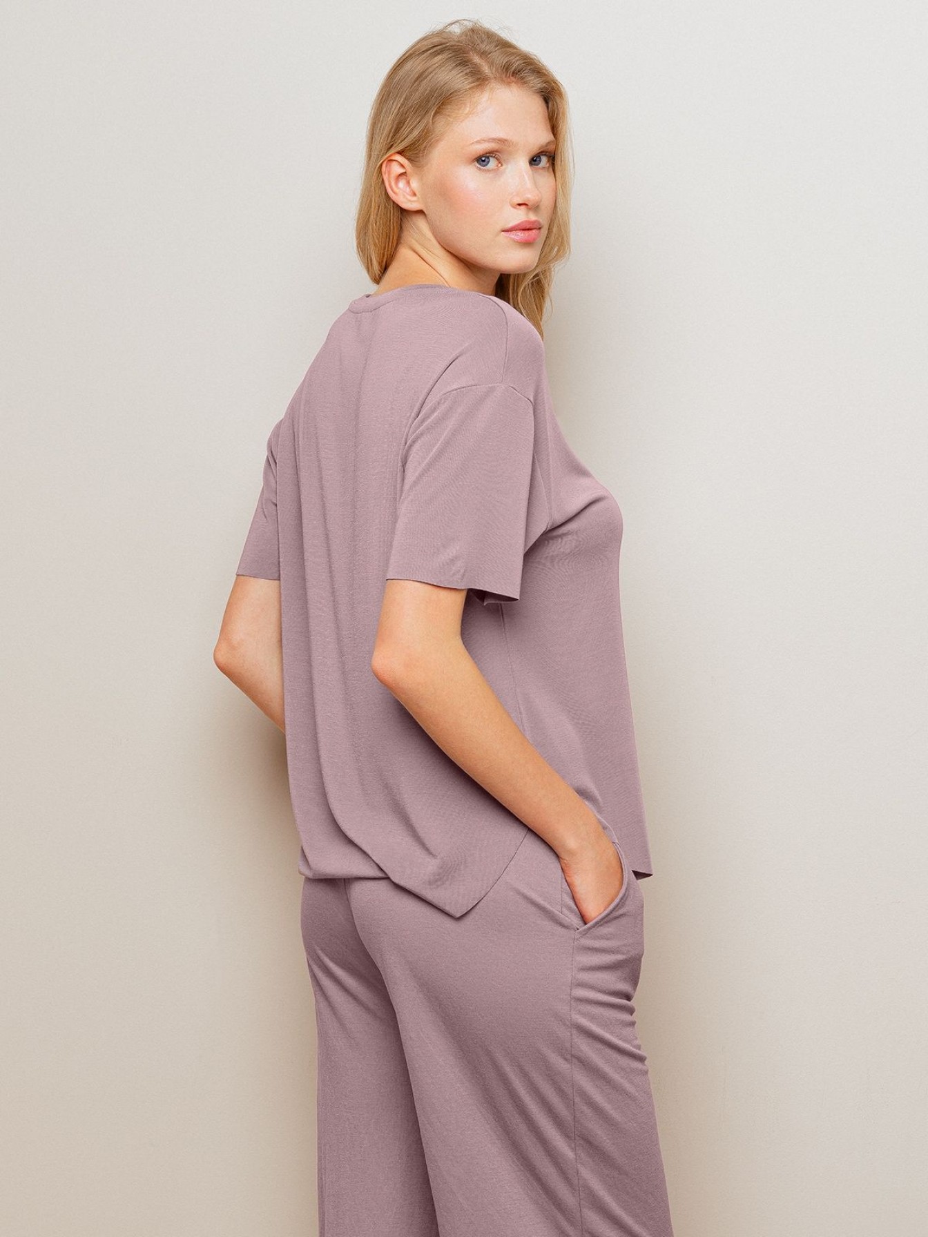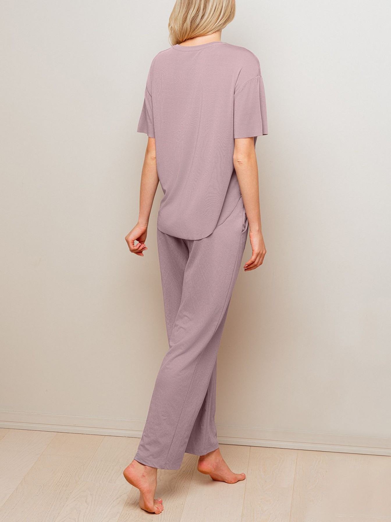 Пижама женская 4274TBC бренда Indefini включает футболку и брюкиФутболка изготовлена из сочетания модала и акрила, она имеет свободный прямой крой и короткий рукаваБрюки изготовлены из сочетания вискозы и нейлона, имеют прямой свободный крой и карманы по бокам
