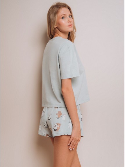 Пижама женская 4277TBD, изготовленная из хлопкового трикотажа, выполнена в классическом зеленом цвете.Комплект состоит из футболки и шорт.Футболка прямого кроя имеет нагрудный карман и округлый вырез.Шорты на мягкой эластичной резинке крепко сидят на талии.Пижама украшена анималистичным принтом.