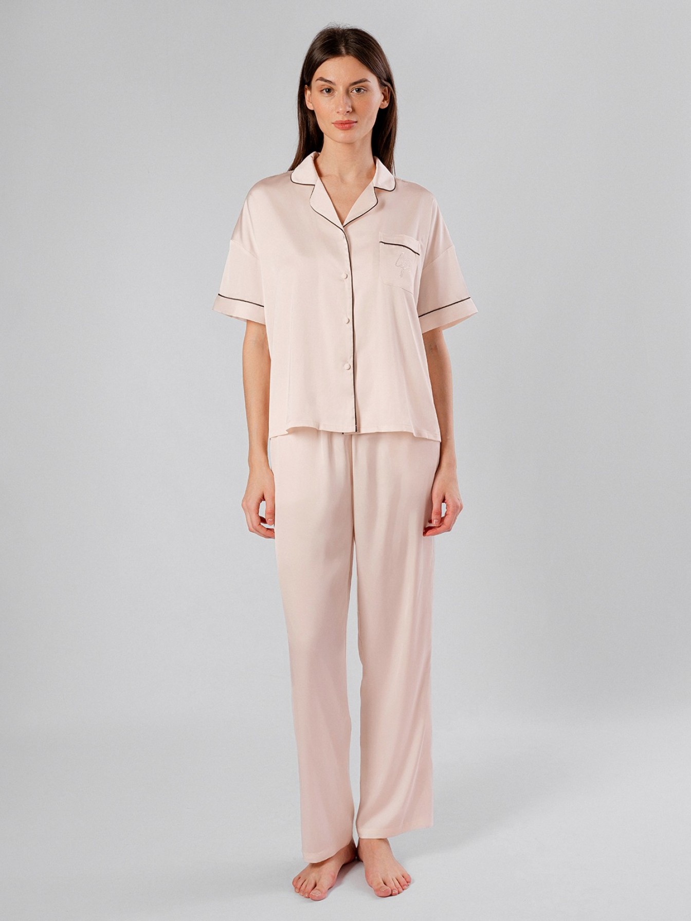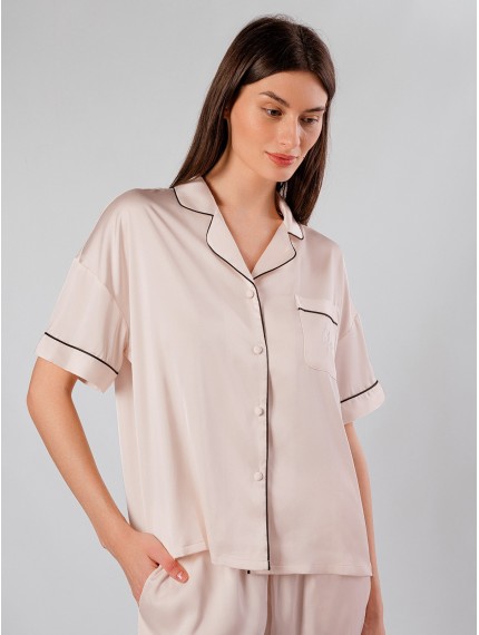Пижама женская 5007TBC бренда Indefini изготовлена из полиэстера.Состоит из рубашки и брюк.Рубашка с короткими рукавами и отложным воротником украшена V-образной кружевной вставкой сзади.Нагрудный карман рубашки украшен стразами.Брюки прямого кроя имеют мягкую резинку на талии и боковые карманы.