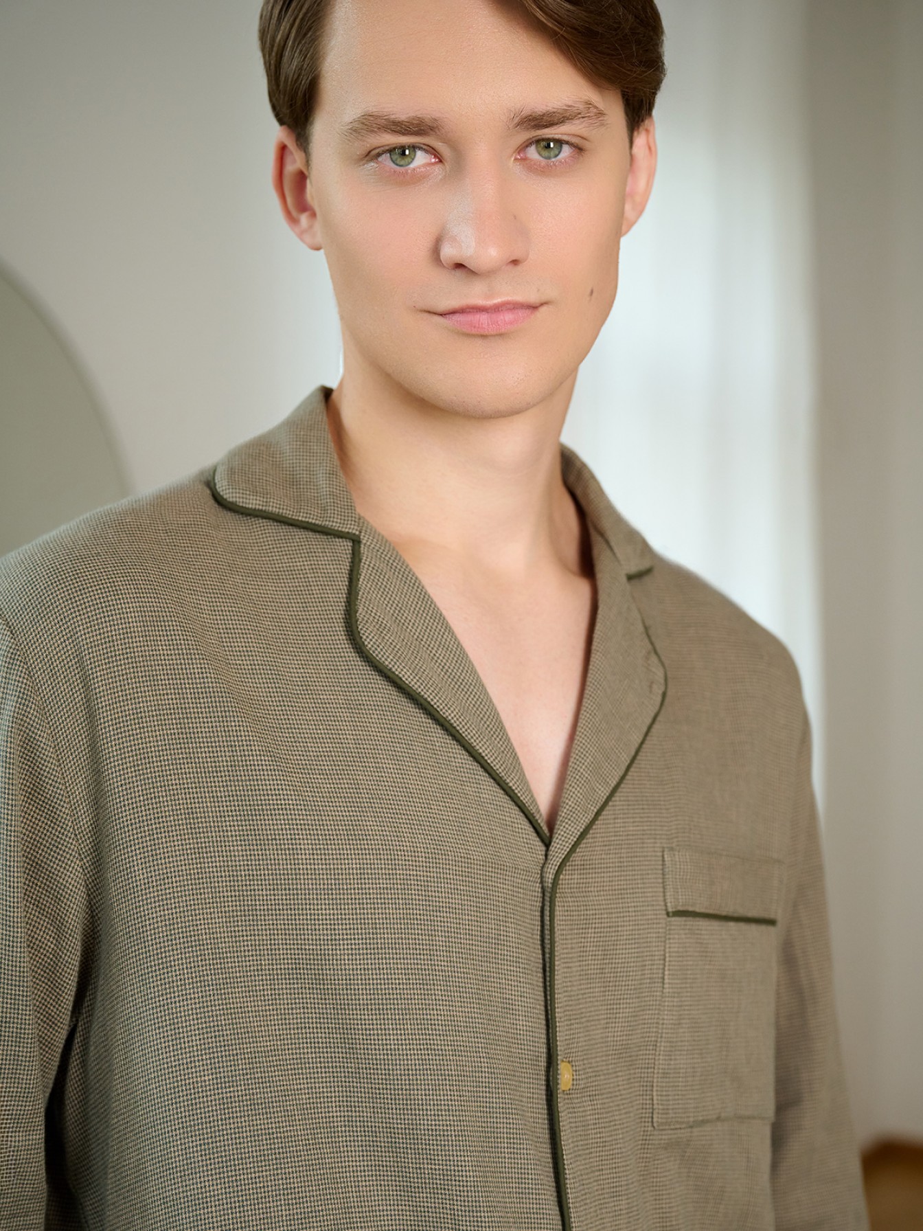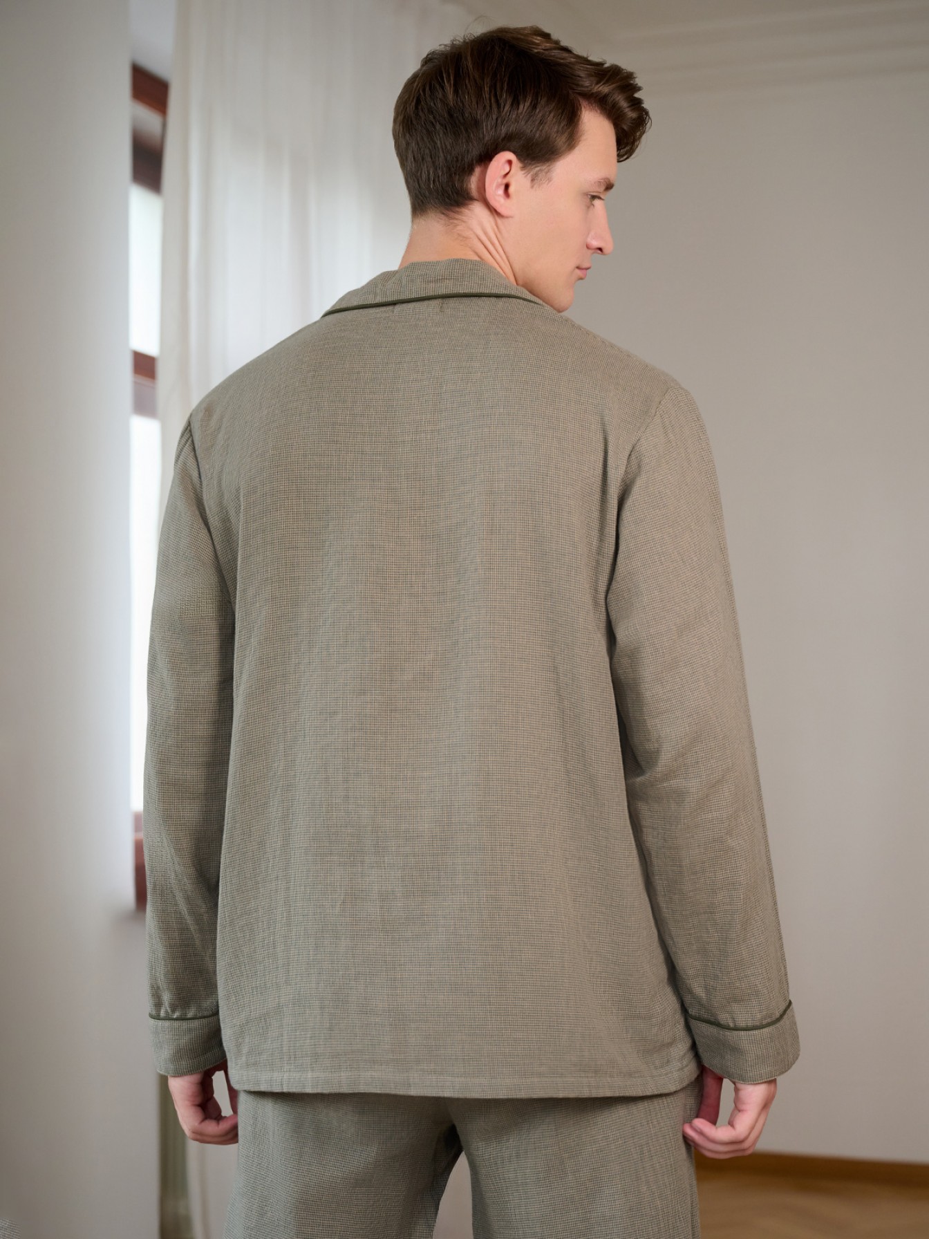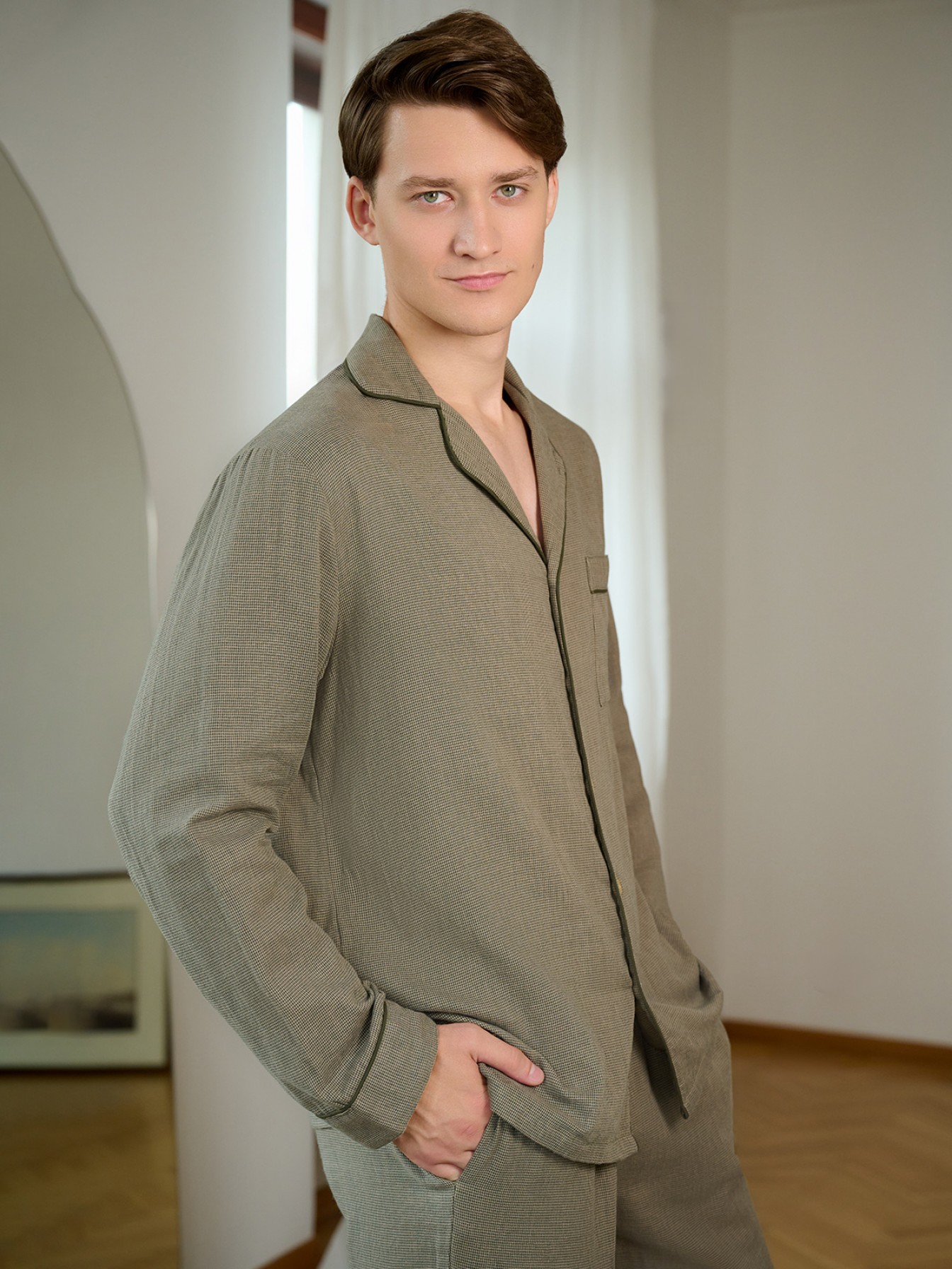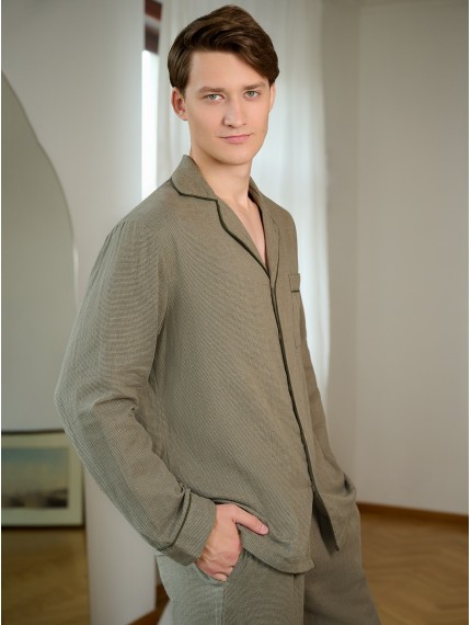 Мужская пижама Indefini (Арт. 5013PCC) выполнена из 100% хлопка.В комплект входит рубашка и брюки оливкового цвета с мелким текстурным узором.Рубашка свободного кроя с длинными рукавами, отложным воротником и пуговицами спереди. На груди расположен накладной карман.Брюки прямого кроя на мягкой резинке с шнурком для регулировки посадки, имеют удобные боковые карманы.Пижама идеально подходит для домашнего отдыха и сна, обеспечивая комфорт и приятные тактильные ощущения.