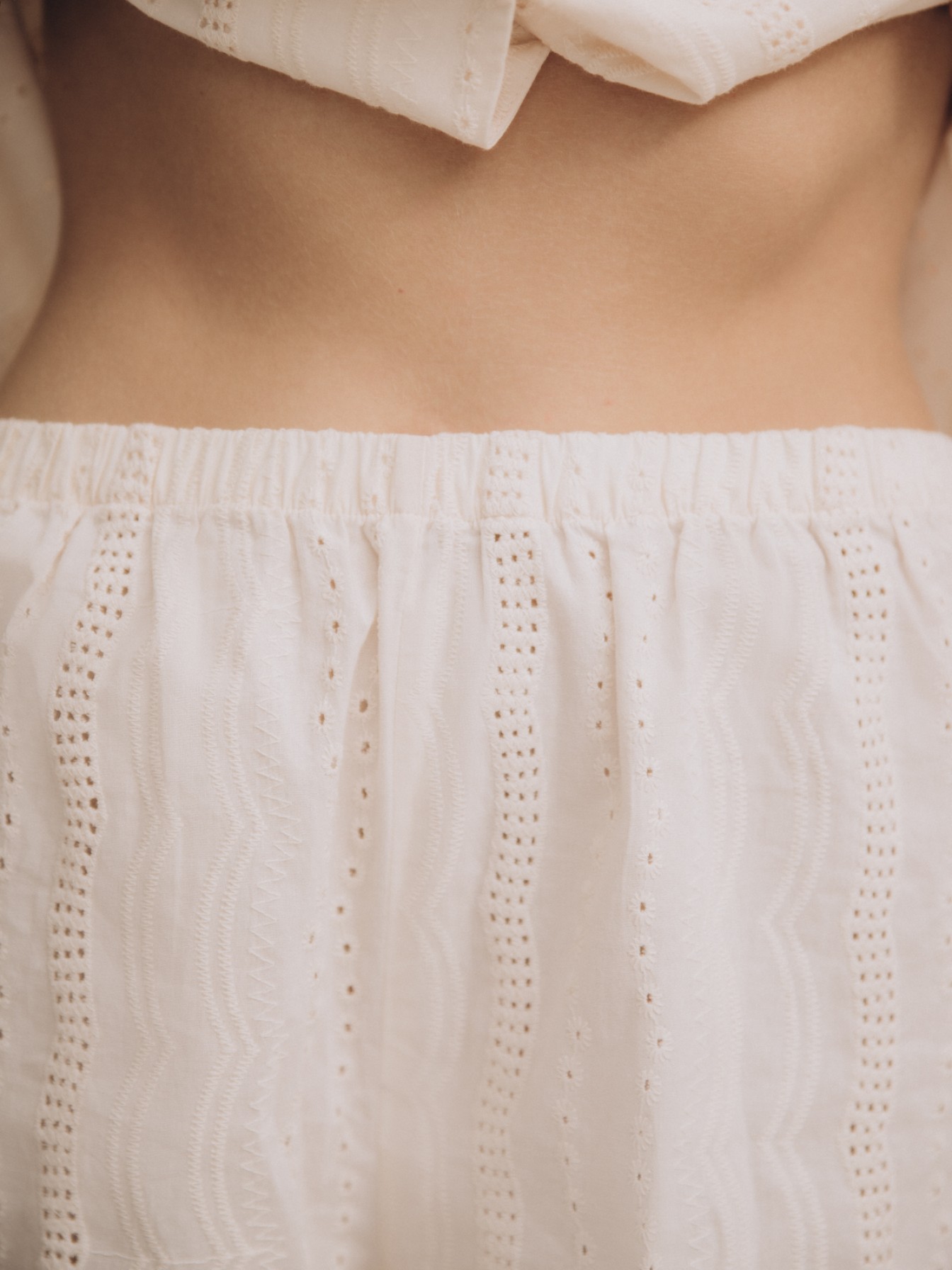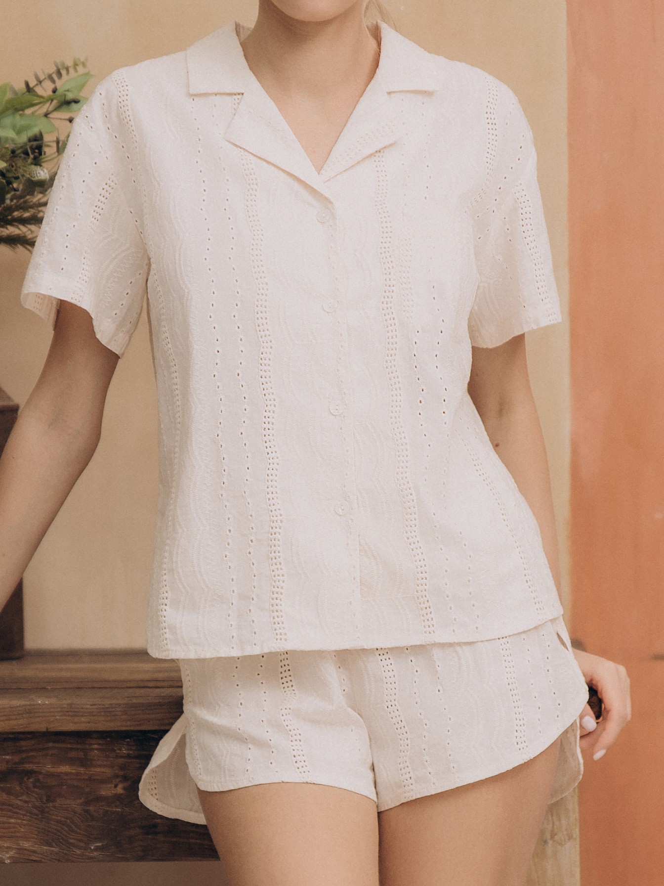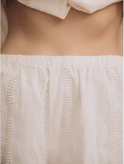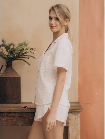 Пижама женская 5044TBD бренда Indefini изготовлена из хлопковой ткани.Выполнена в молочном цвете.Ткань пижамы выполнена с ажурной вышивкой.В комплект входят рубашка с шортами.Рубашка прямого кроя имеет короткие рукава и отложной воротник.Застёгивается спереди на пуговицы в цвет ткани.Шорты держатся на талии мягкой эластичной резинкой.