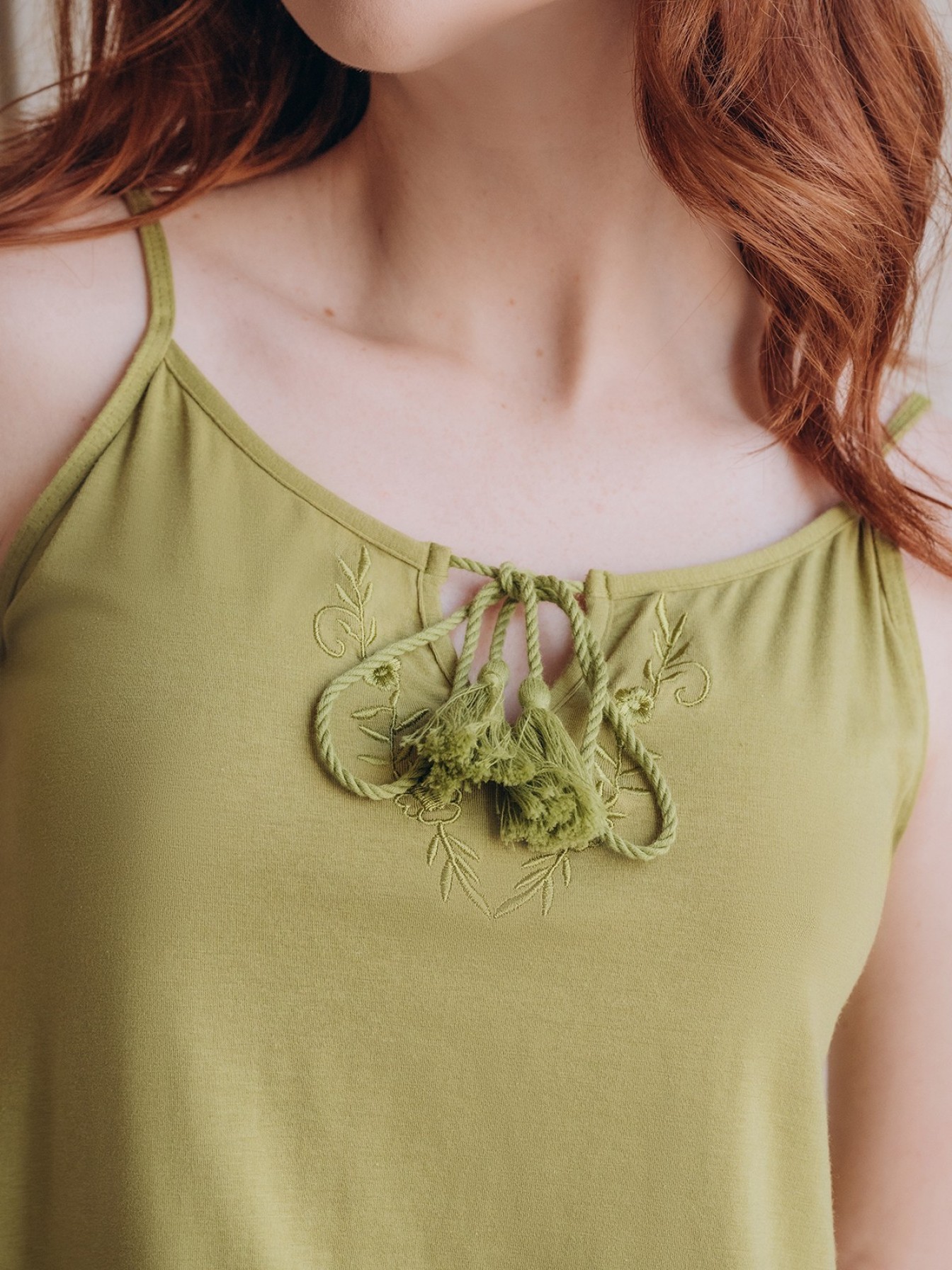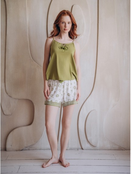 Пижама женская 5052TDP бренда Indefini изготовлена из смеси бамбука и хлопка.Она состоит из майки и шорт.Майка выполнена в зеленом цвете на тонких регулируемых бретелях.Зона декольте украшена цветочной вышивкой и двумя завязываемыми шнурками с кисточками.Шорты выполнены в белом цвете с абстрактным принтом.Они имеют мягкую эластичную резинку на талии с вязаным регулирующим шнурком с кисточками.