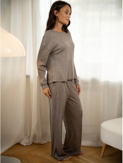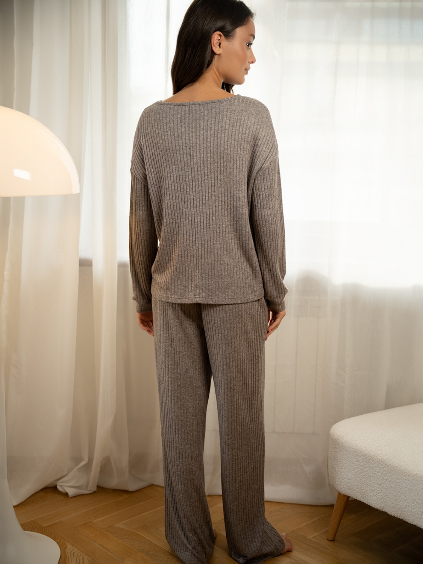 Женская пижама бренда Indefini теплого серого цвета — идеальный выбор для уютных вечеров и комфортного сна.Состоит из верхней части с длинными рукавами и удобных брюк, обеспечивающих свободу движений. Мягкая и нежная ткань деликатно облегает тело, создавая ощущение тепла и комфорта.Безупречный крой и спокойный бежевый оттенок придают образу нежность и элегантность. Пижама легко сочетается с домашним халатом и тапочками, оставаясь стильным и функциональным элементом домашнего гардероба.