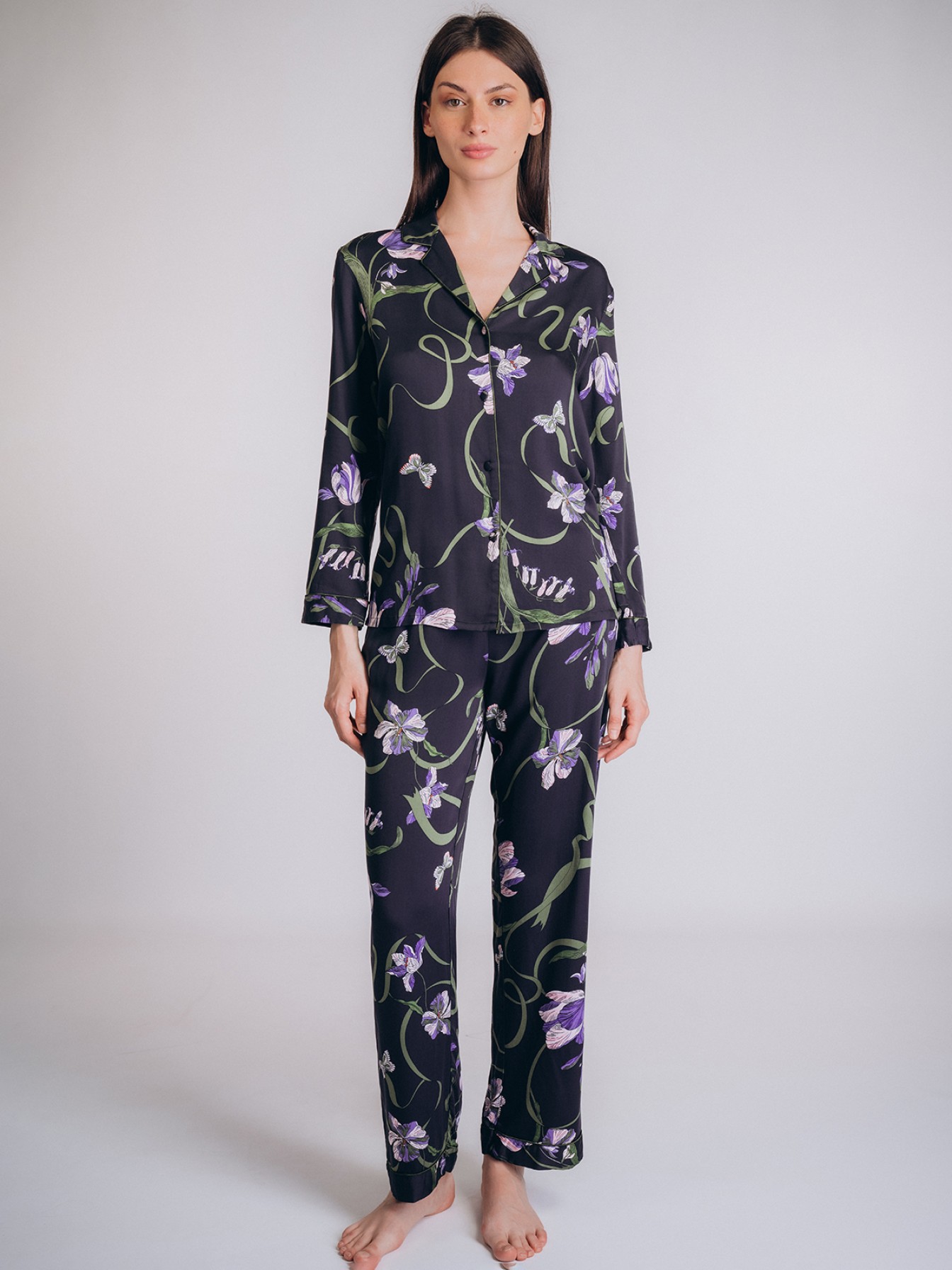 Пижама выполнена из мягкой и приятной на ощупь вискозы, что делает её идеальной для комфортного сна и отдыха.Особенности:Рубашка: с длинными рукавами, украшенными прошитыми заворотами. На рубашке расположены тканевые пуговицы, которые добавляют элегантности. Край рубашки и воротник декорированы тонкой зелёной оборкойБрюки: свободного кроя, с прошитыми заворотами, обеспечивающими аккуратный вид. Пояс выполнен из эластичной резинки, что гарантирует удобную посадку.Принт: тёмный фон с цветочным узором в зелёных и фиолетовых тонах.