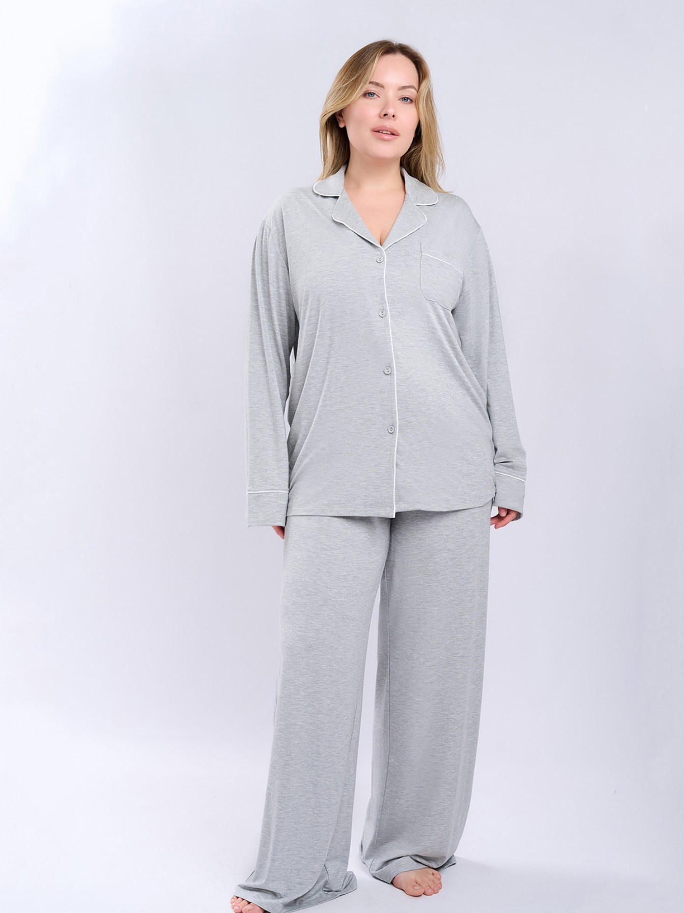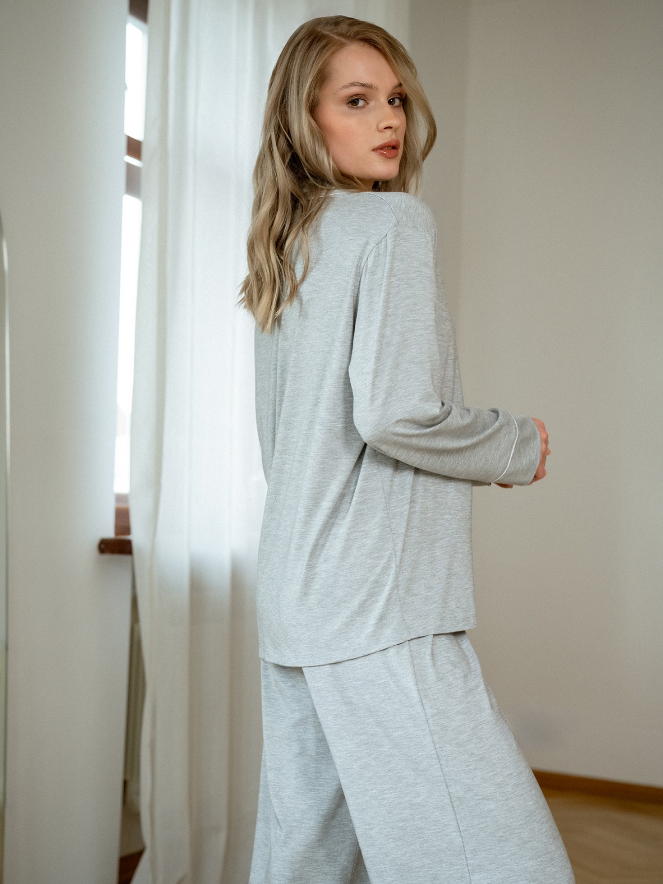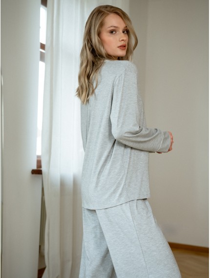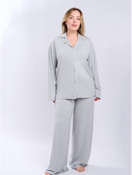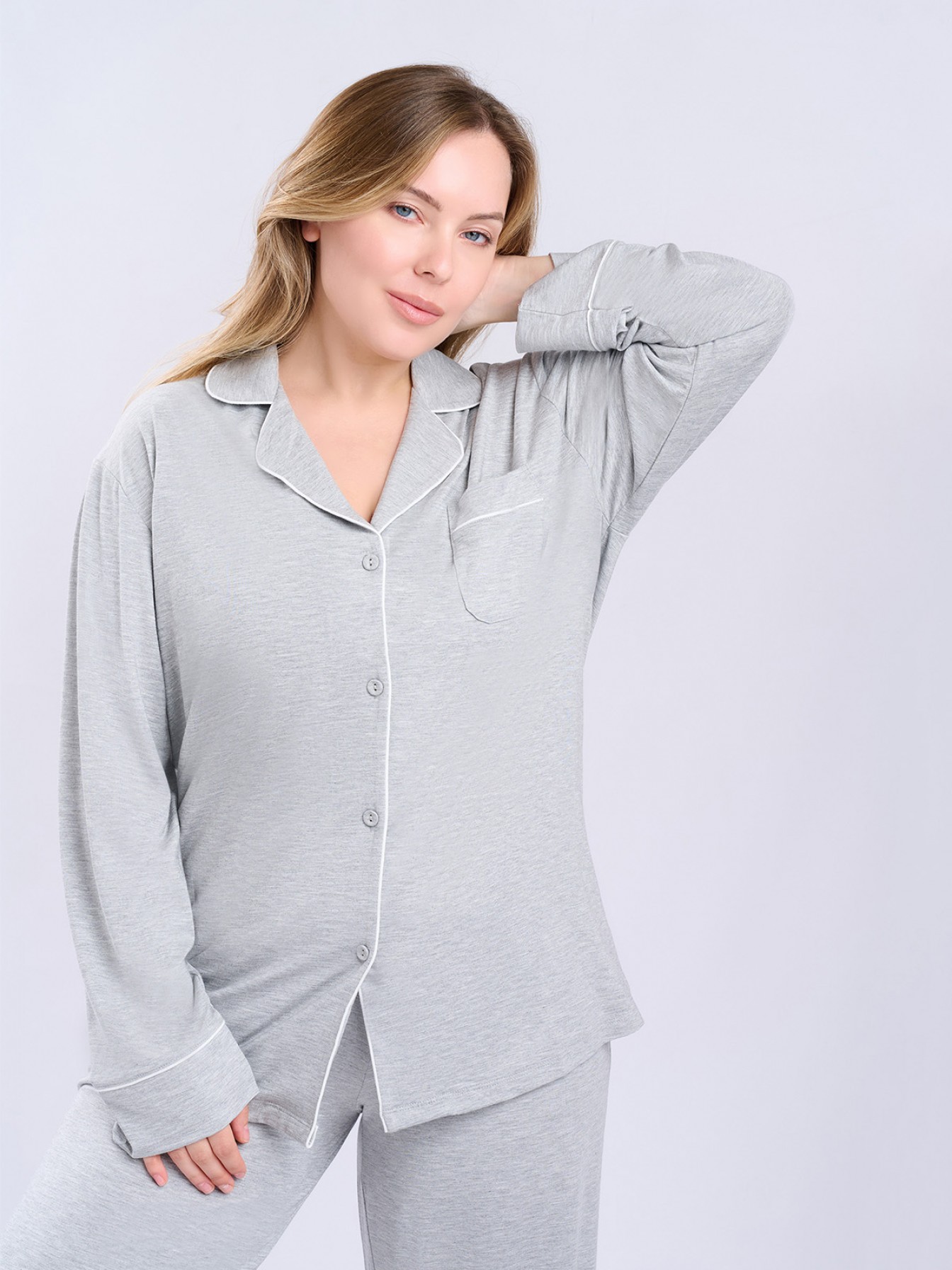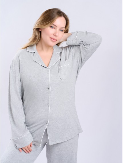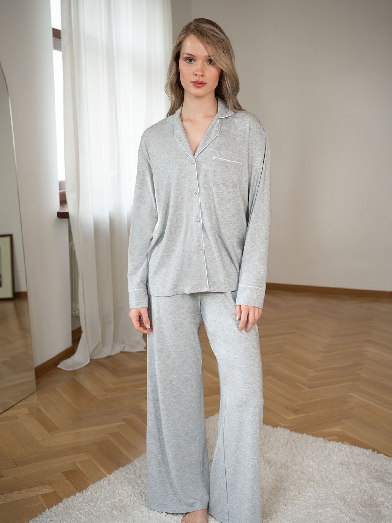 Женская пижама Indefini выполнена в светло-сером цвете из мягкой вискозной ткани с добавлением полиэстера и эластана. Комплект состоит из рубашки на пуговицах с длинными рукавами, отложным воротником и нагрудным карманом, а также прямых брюк на мягкой эластичной резинке.Особое внимание привлекают декоративные пуговицы на шортах, которые добавляют образу стильный акцент.Легкая и приятная к телу ткань обеспечивает отличную воздухопроницаемость, комфорт и свободу движений в течение всего дня и ночи. Классический крой и лаконичный дизайн делают эту пижаму идеальным выбором для домашнего отдыха и сна.Идеальный вариант для тех, кто ценит уют, практичность и современный стиль.