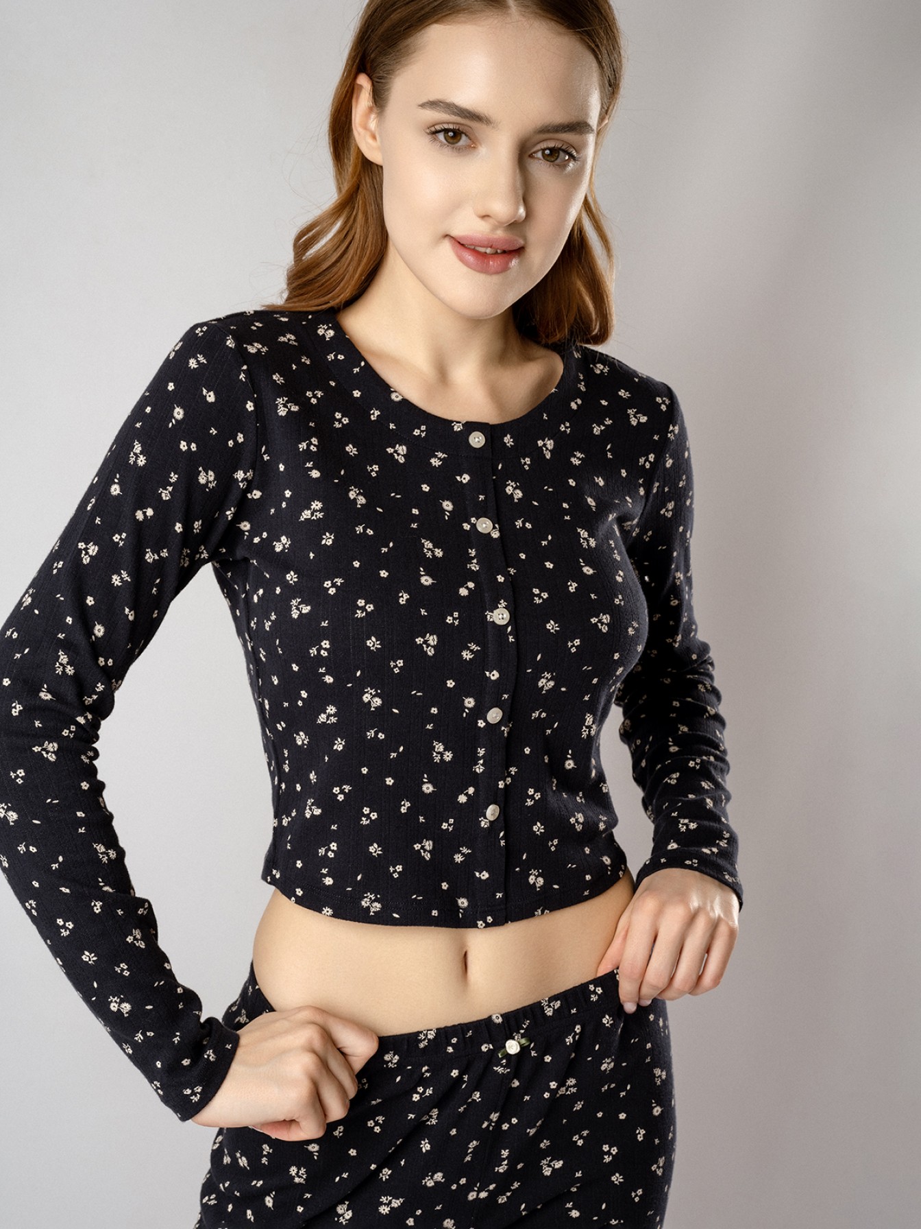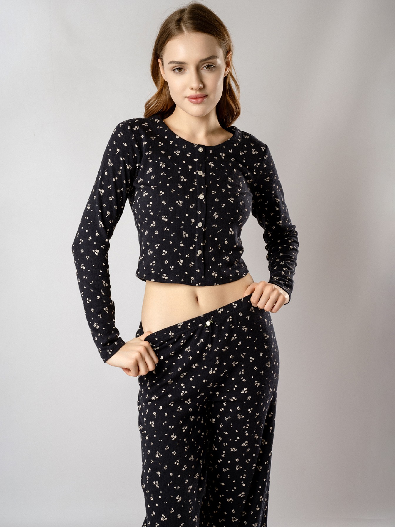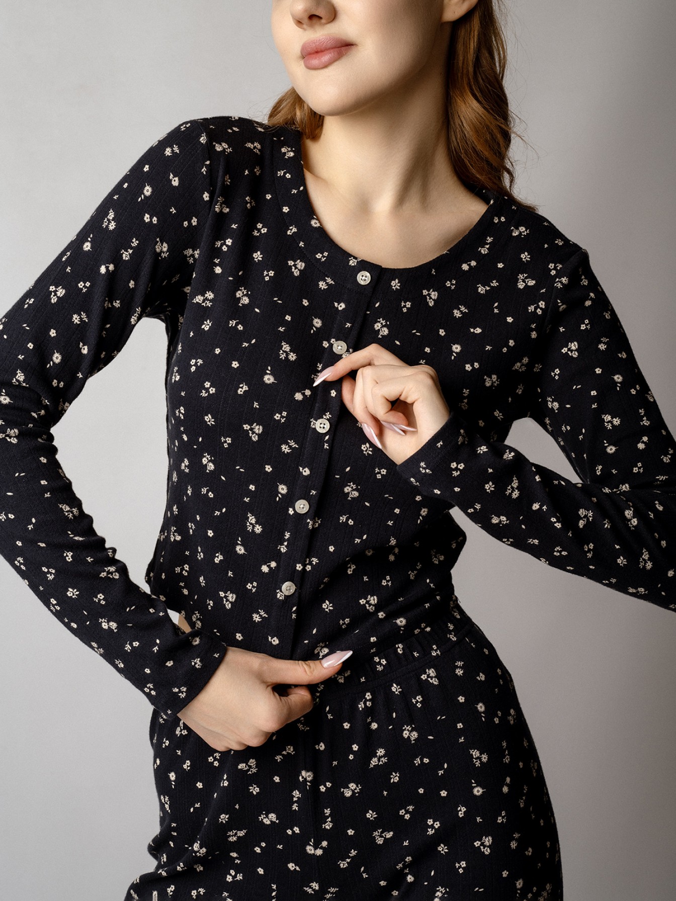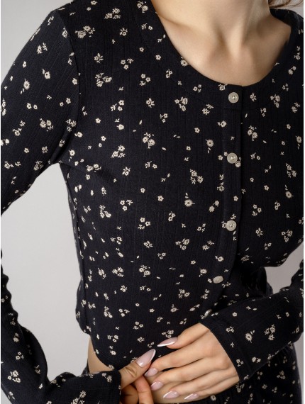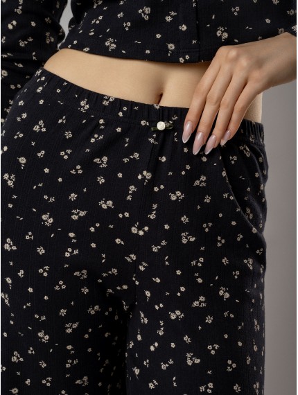 Кофта с длинными рукавами украшена рядом декоративных пуговиц на груди. Брюки дополнены «розочкой» на поясе — выразительным элементом, который придает модели романтичный характер.Глубокий чёрный цвет в сочетании с нежным цветочным принтом создаёт утончённый образ, гармонично соединяя сдержанную элегантность и женственность.