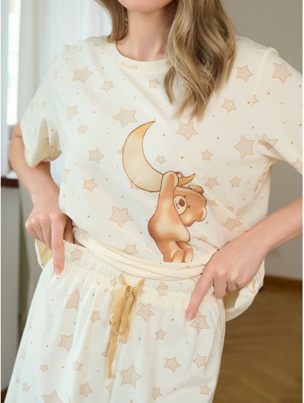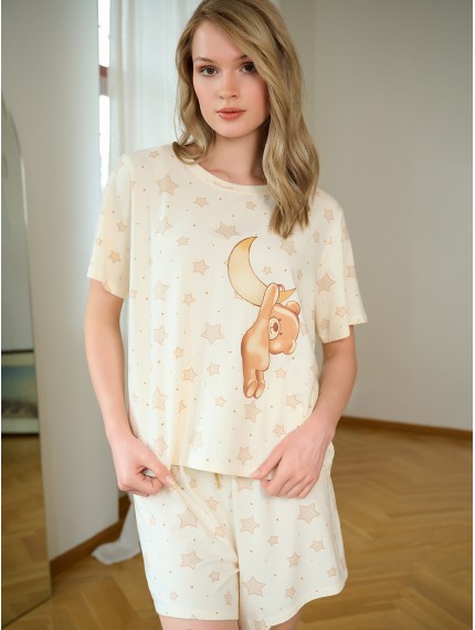 Пижама женская 5189TBD бренда Indefini изготовлена из смеси модала, хлопка и эластана.Она состоит из футболки и шорт.Футболка выполнена в нежно-кремовом цвете с принтом звездочек и центральным изображением милого медвежонка.Шорты выполнены в том же стиле — кремовый фон с принтом звездочек.Они имеют мягкую эластичную резинку на талии с регулирующим шнурком.