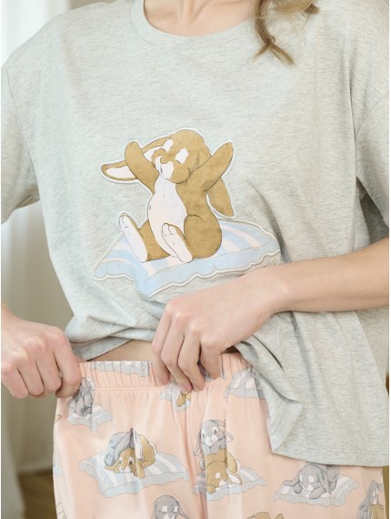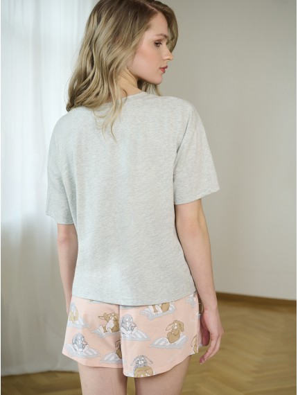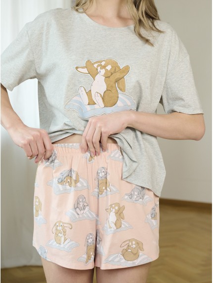 Пижама женская 5231TBD бренда Indefini изготовлена из 100% хлопка.Состоит из футболки и шорт.Выполнена в двухцветной комбинации: футболка — светло-серая меланж, шорты — нежно-розовые.Футболка свободного кроя с круглым вырезом горловины и короткими рукавами. На груди расположен принт с изображением милого кролика на подушке.Шорты на мягкой эластичной резинке с повторяющимся принтом кроликов на подушках по всему изделию.