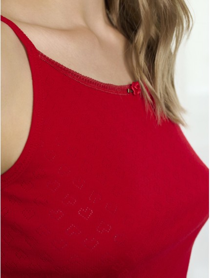 Пижама женская изготовлена из полиэстера с добавлением хлопка и вискозы. В комплекте майка с шортами. Майка на тонких регулируемых бретелях имеет декоративный элемент в зоне декольте. Шорты с аналогичным декоративным элементом держатся на талии тонкой эластичной резинкой.