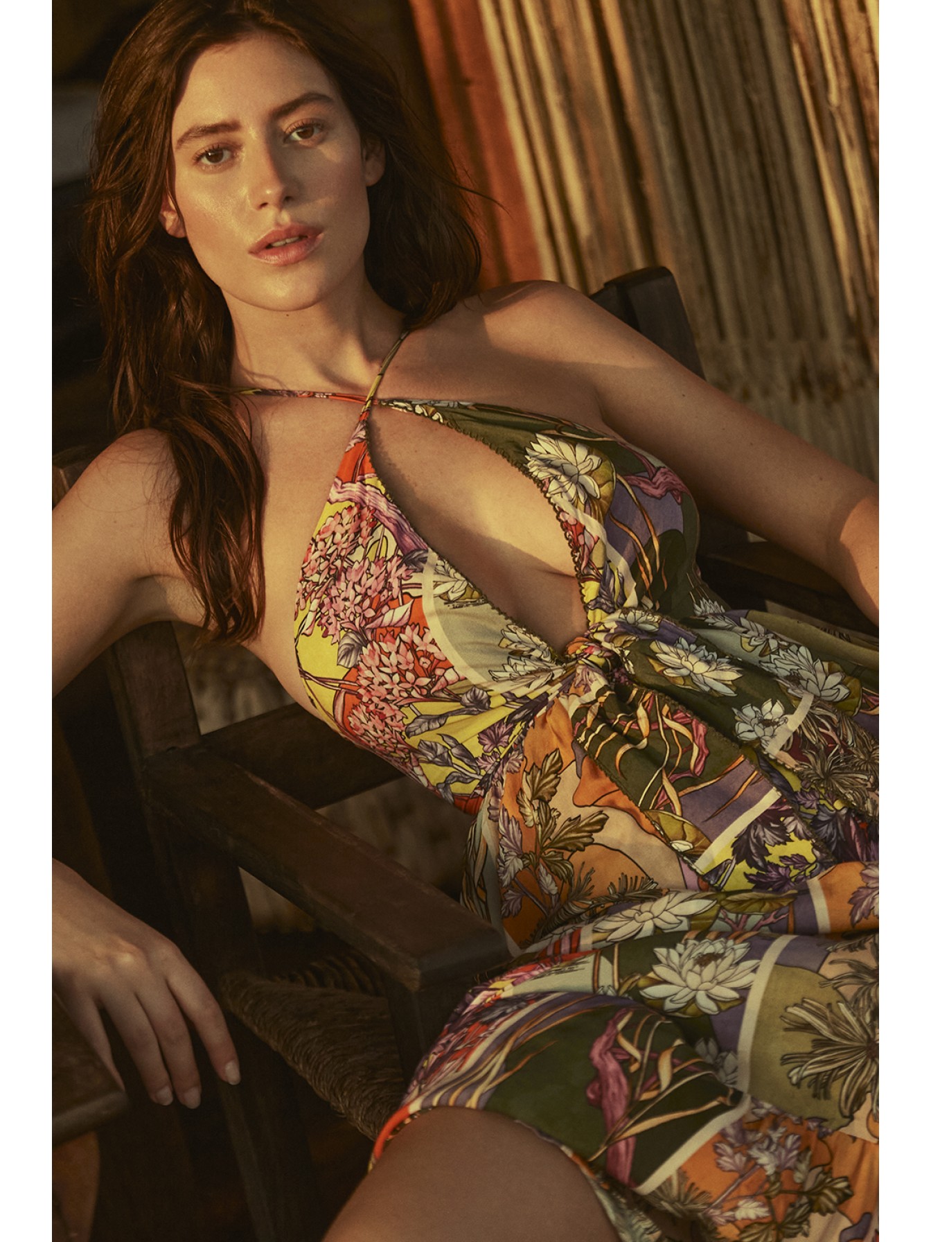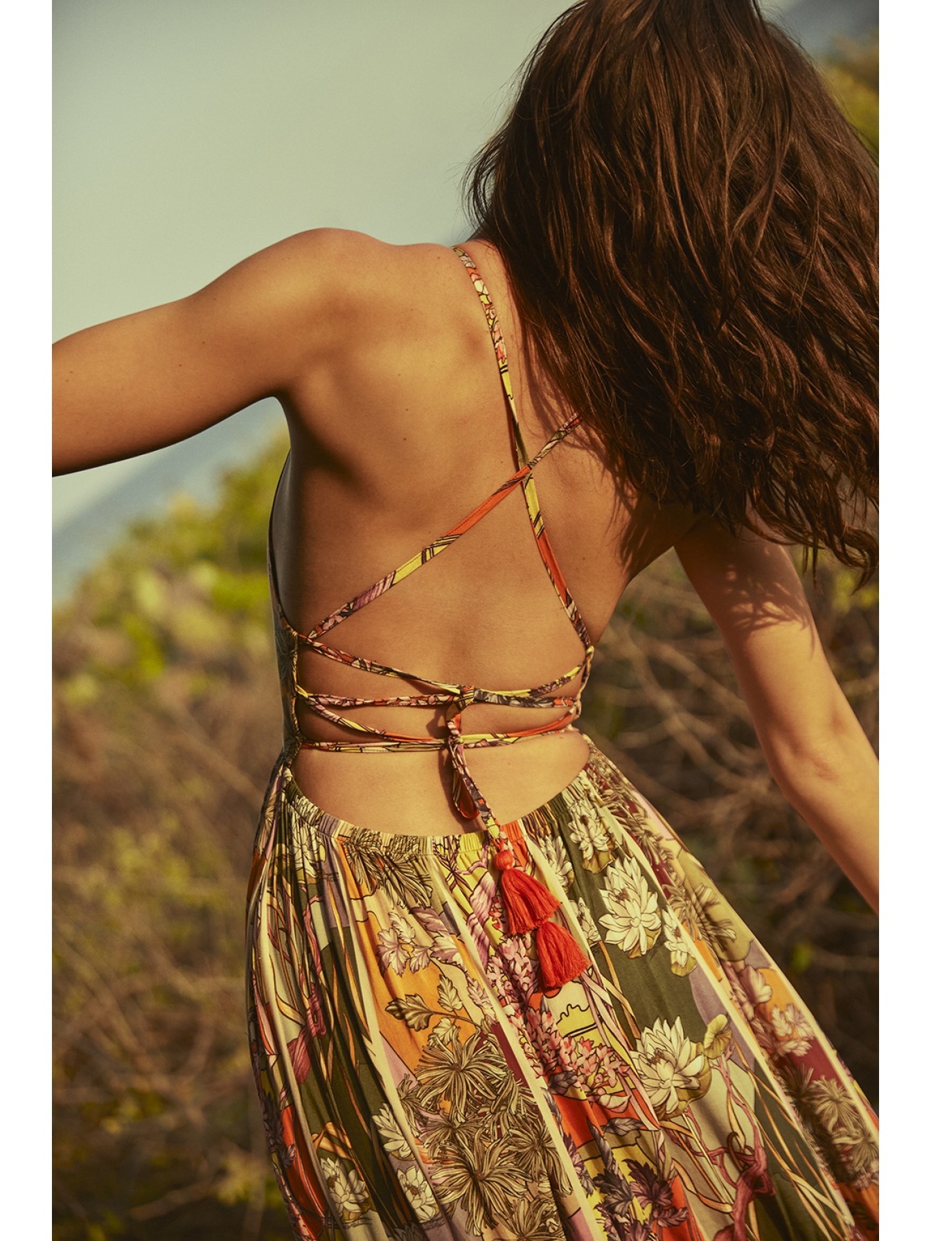Платье макси с глубоким V-образным вырезом и тонкими бретелями. Уникальные детали и рисунки ручной работы.