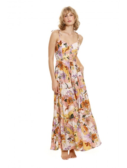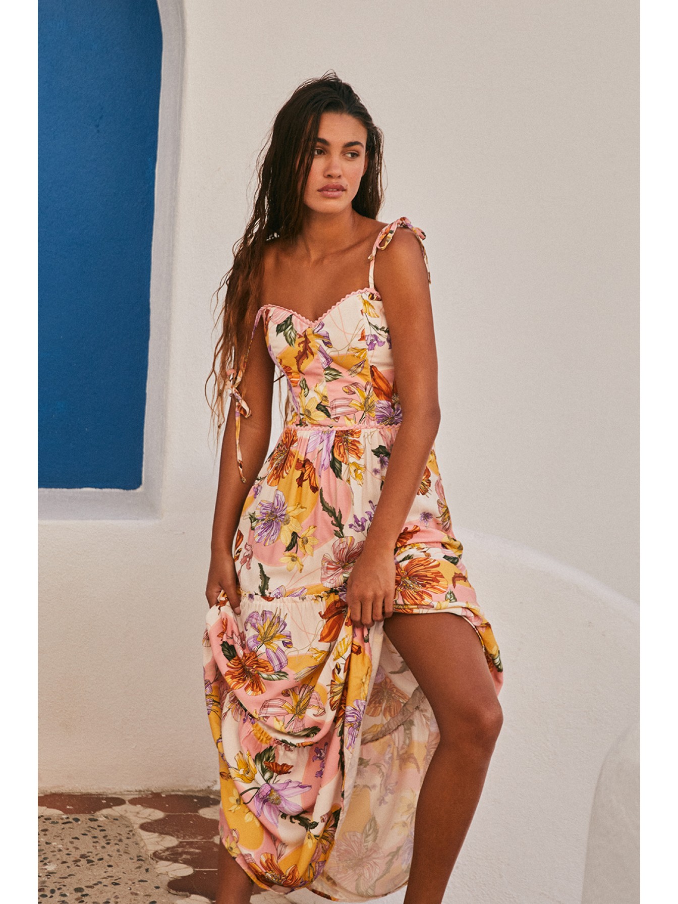 Длинное платье Suzie с контрастным цветочным принтом на тонких бретелях с завязками. Идеальный образ для пляжа и улицы.