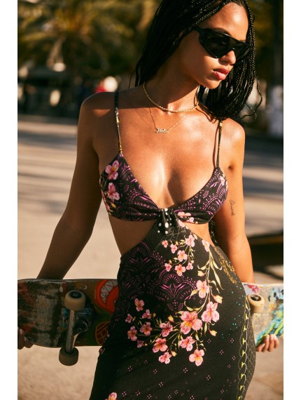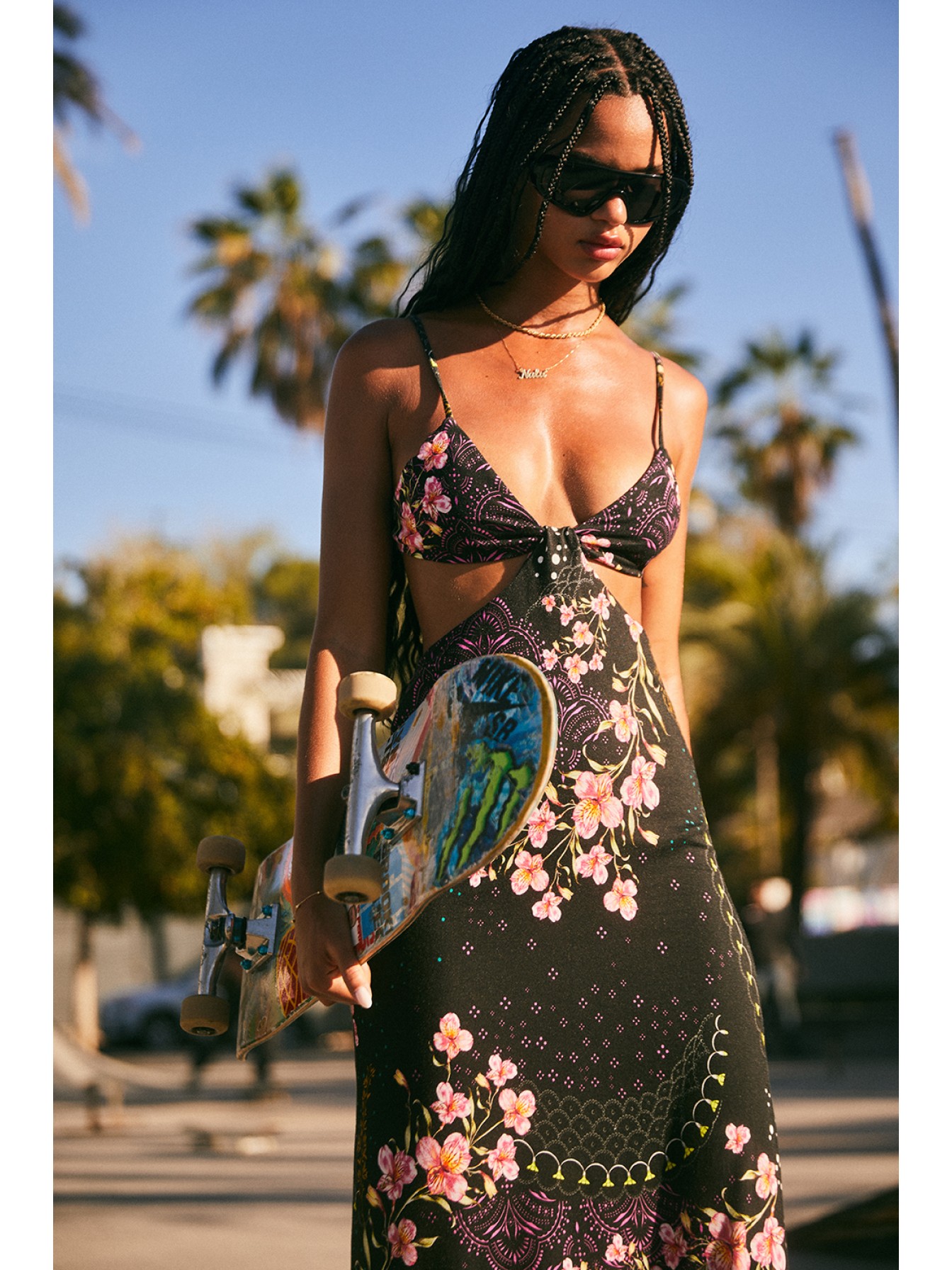 Длинное платье Selene с контрастным принтом, на тонких бретелях и вырезами по бокам. Идеальный образ для пляжа и улицы.