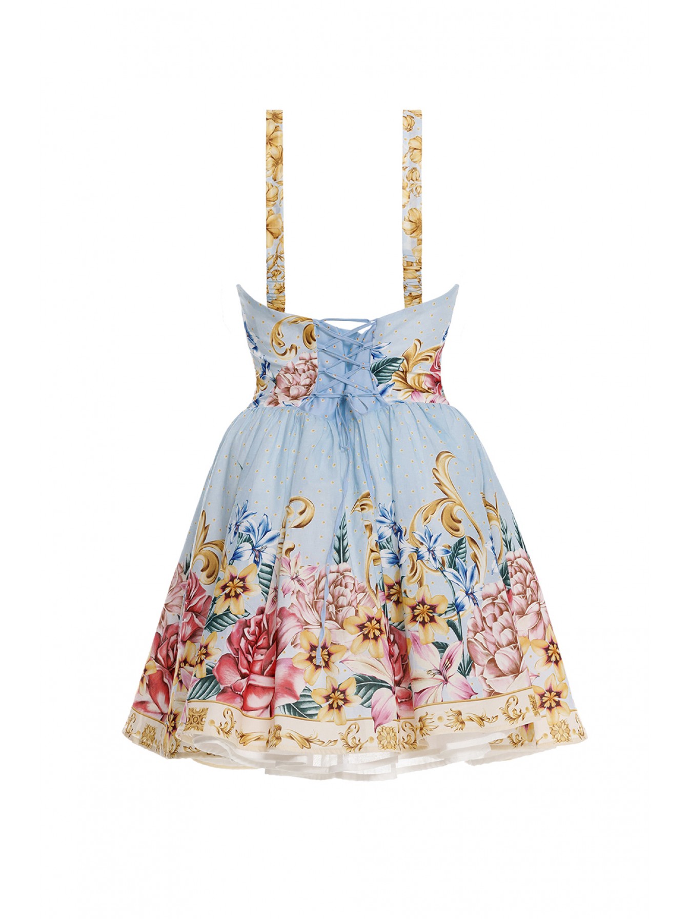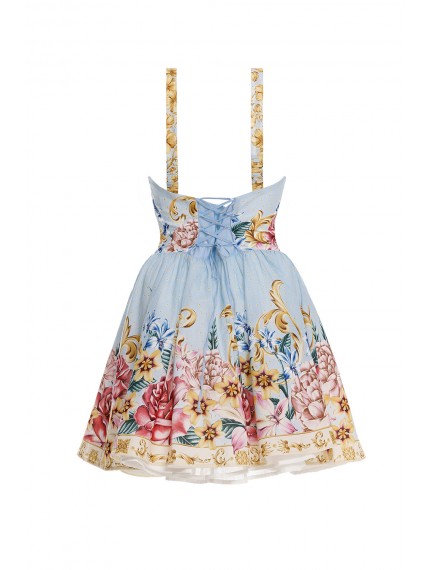 Короткое корсетное платье Spring на тонких бретелях, с милым цветочным принтом. Спинка закрытая, на шнуровке. Спереди чашки также можно скорректировать шнурком. Идеальный образ для пляжного отдыха или прогулки.
