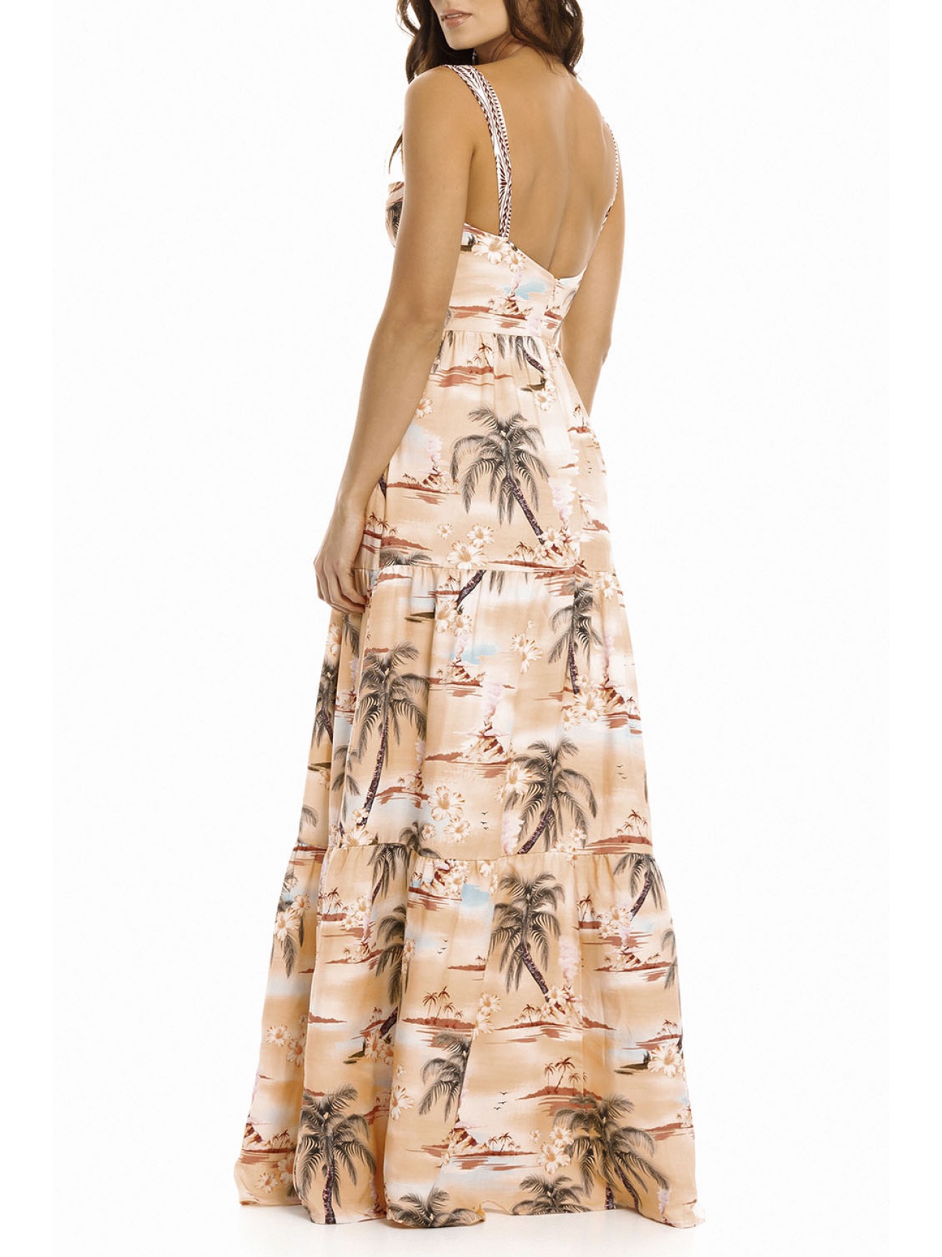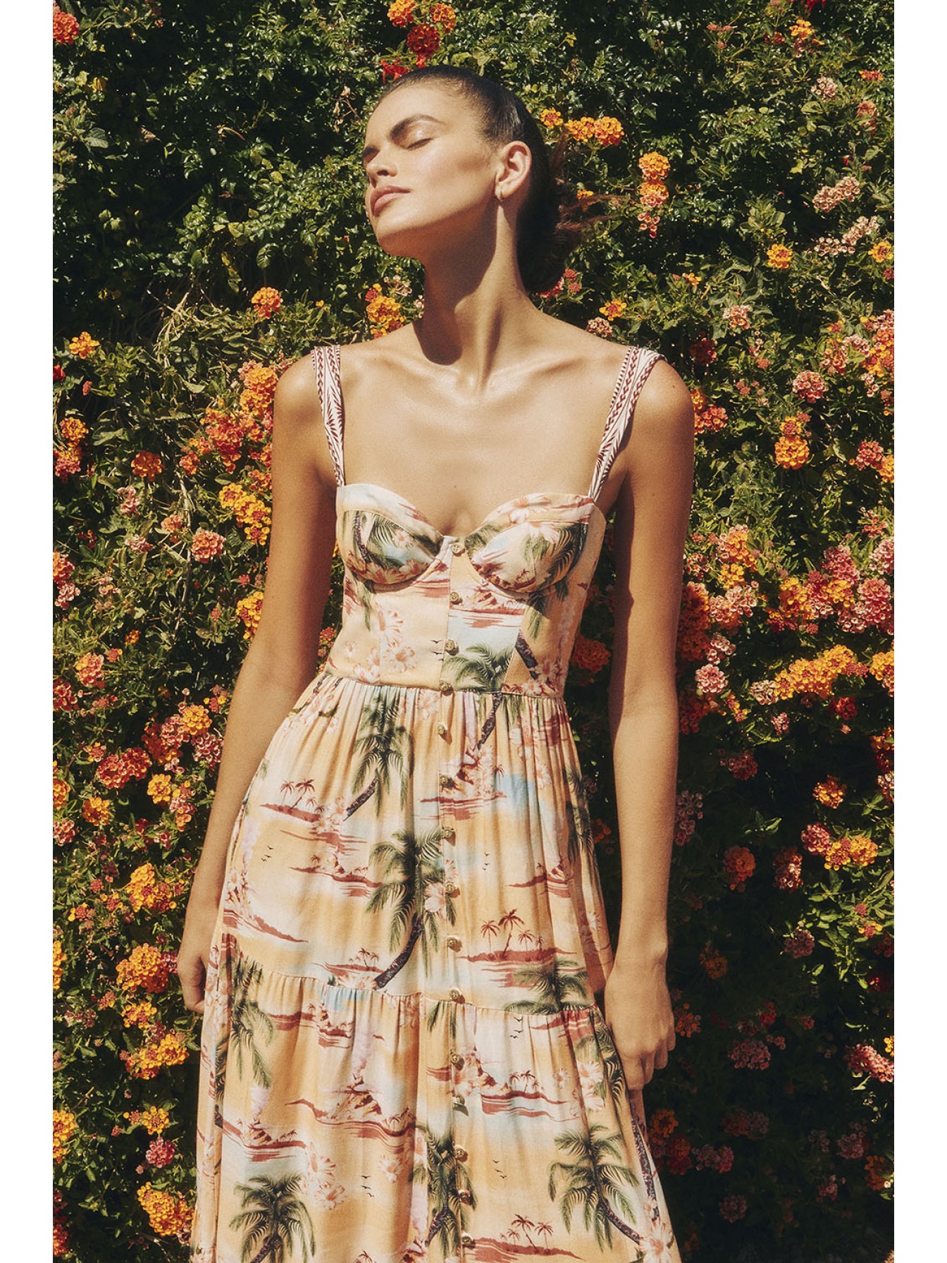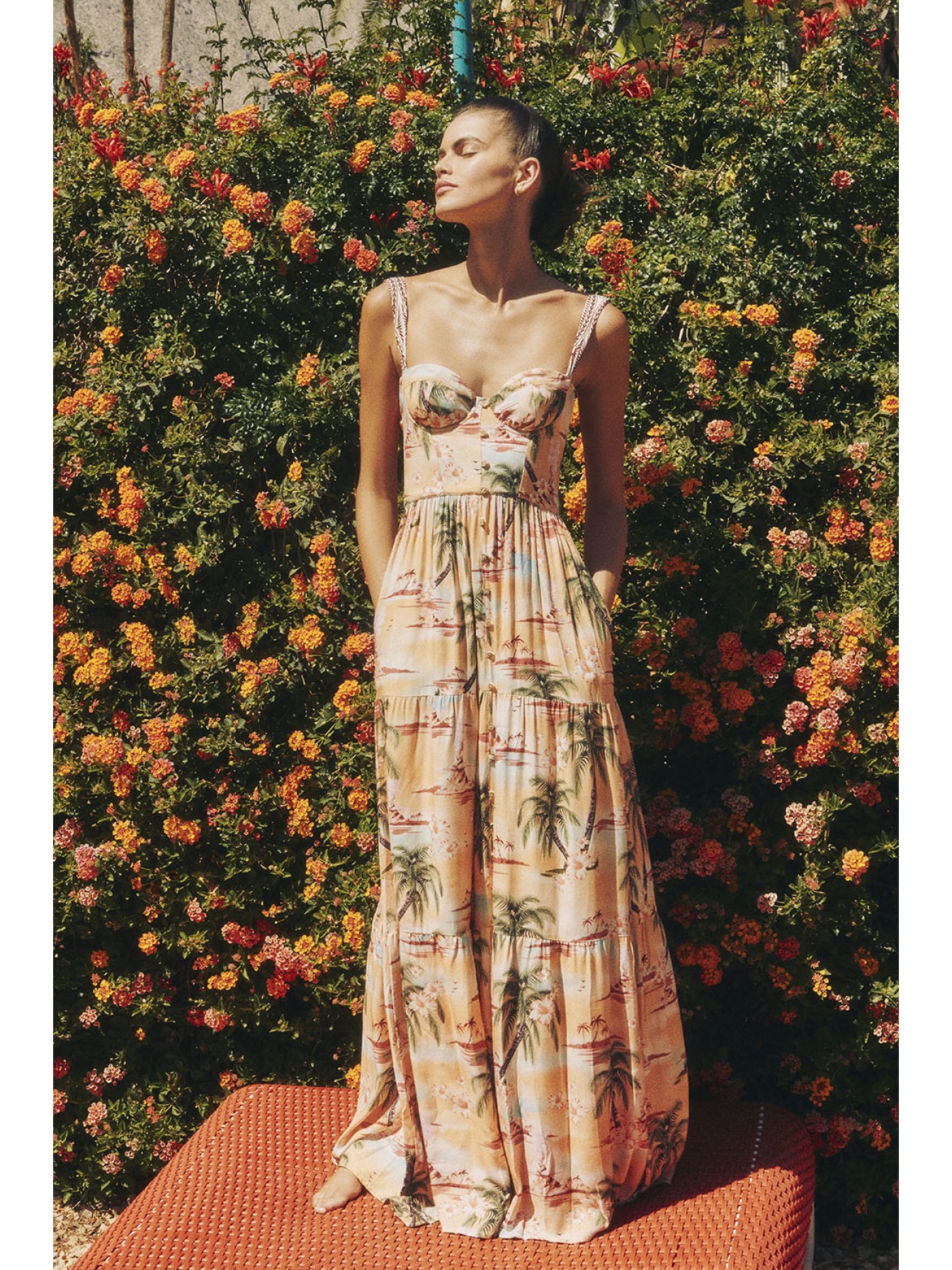 Макси-платье на бретельках украшено пуговицами спереди. Детали бюстгальтера спереди и принты ручной работы завершают образ.
