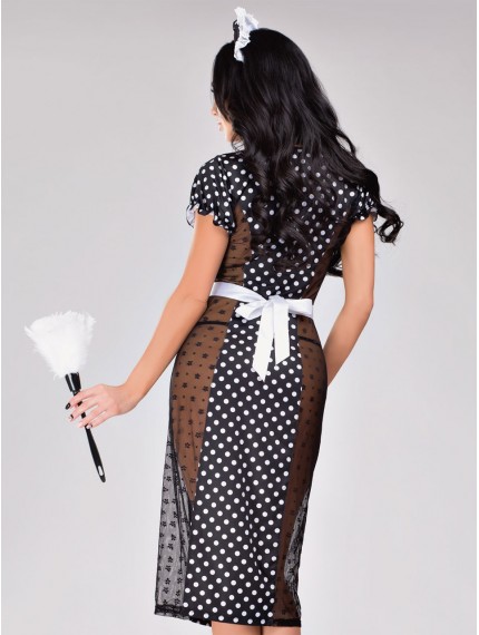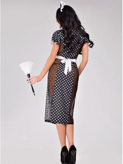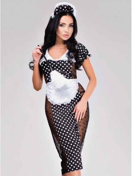 Эротичный и в тоже время целомудренный костюм горничной. Платье-миди выполнено из мягкой микрофибры чёрного цвета в белый горошек, украшено опрятным атласным воротничком, отороченным тонким кружевом. Пикантность, на первый взгляд сдержанному платью, придают полупрозрачные вставки по бокам из сетчатой ткани в мелкий цветочек. Образ дополняют аккуратный атласный фартучек, кружевные трусики-стринг, ободок на голову и кисточка из перьев экзотических птиц. Состав комплекта: платье, трусики, фартук, головной убор, метелка.
