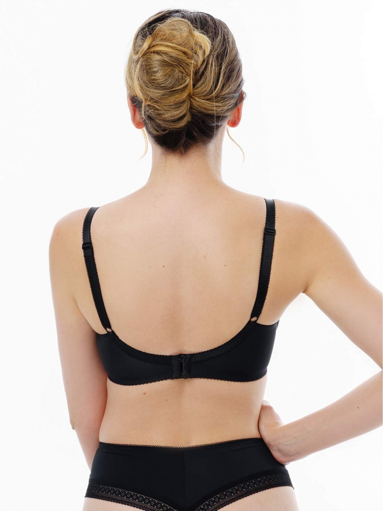Красивый гладкий бюстгальтер на косточках, черного цвета. Мягкая чашка бюстгальтера с кружевным декором и двойными вертикальными рельефами создает округлую форму груди, поддерживает ее снизу и собирает к центру, открывая зону декольте.