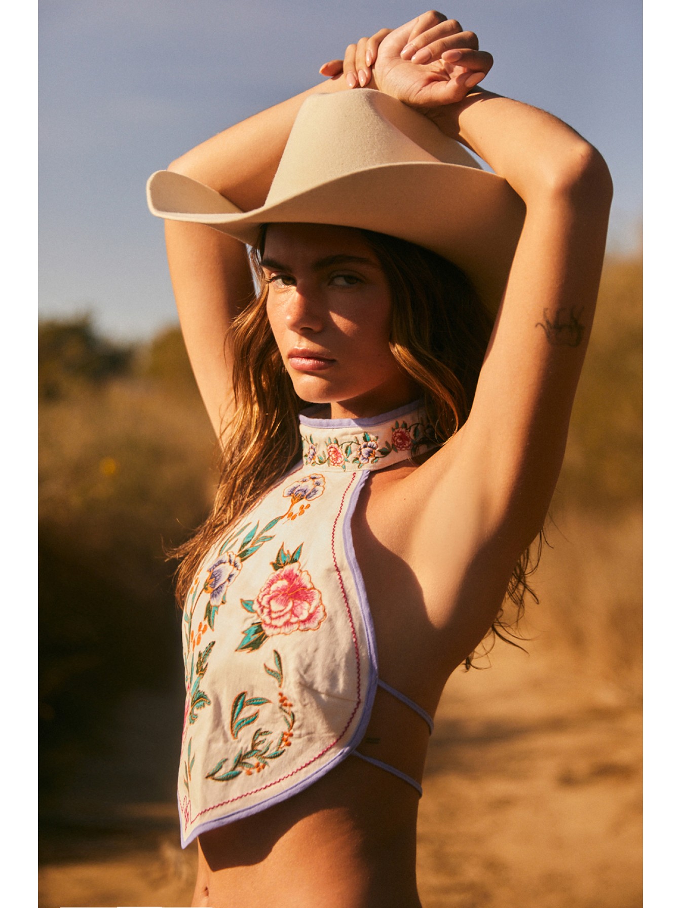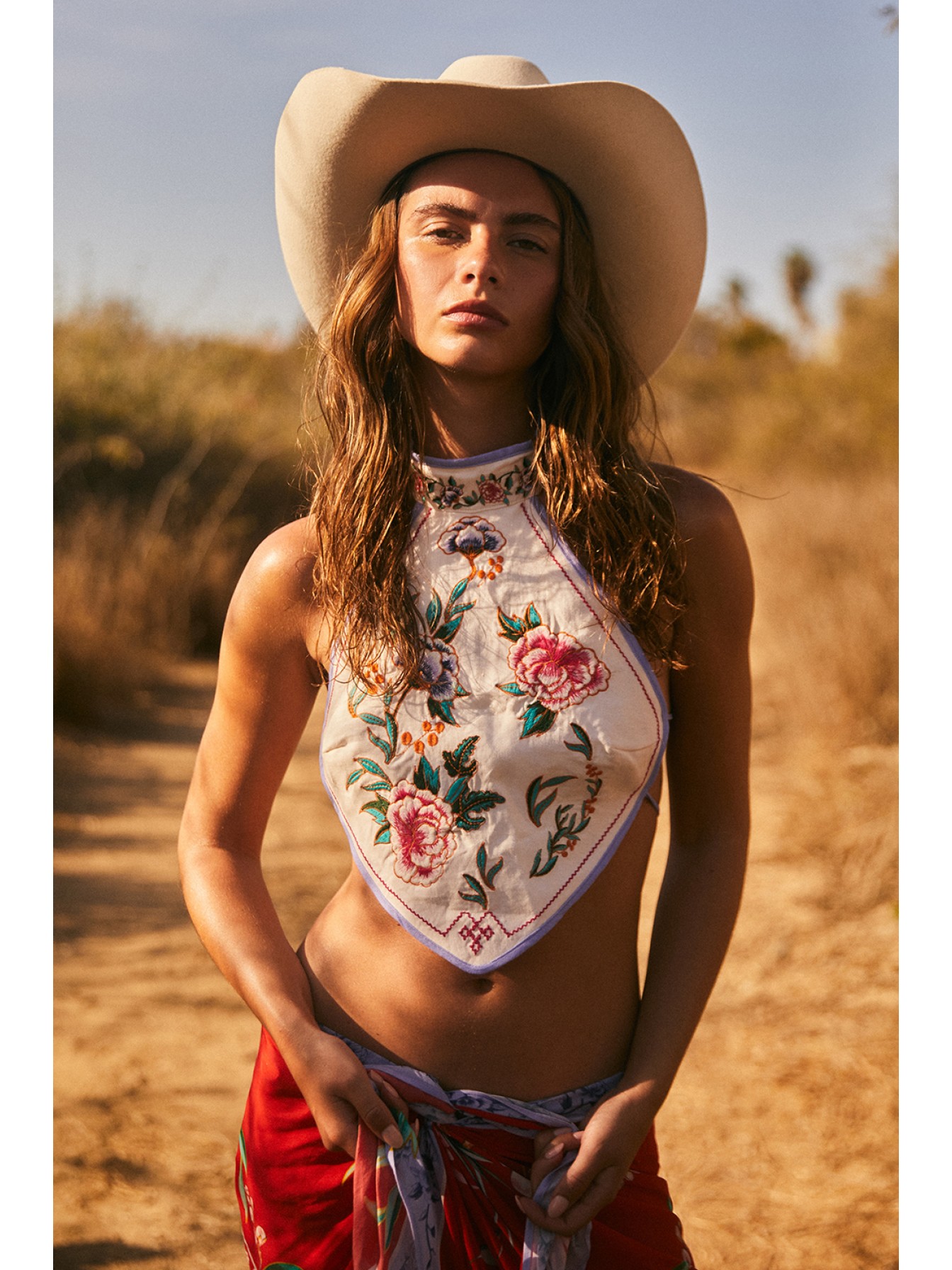 Кроп-топ Elay с контрастным горлом и цветочным принтом. Присутствуют элементы ручной работы: плетение и вышивка.