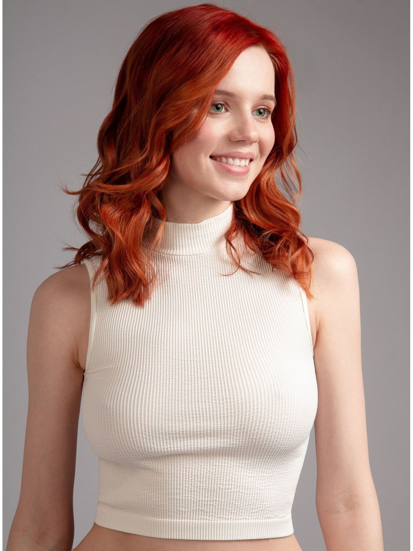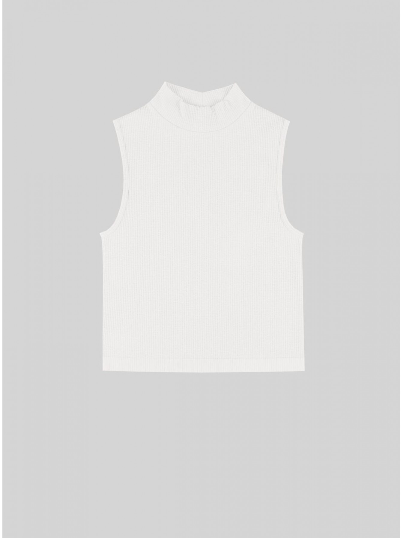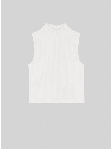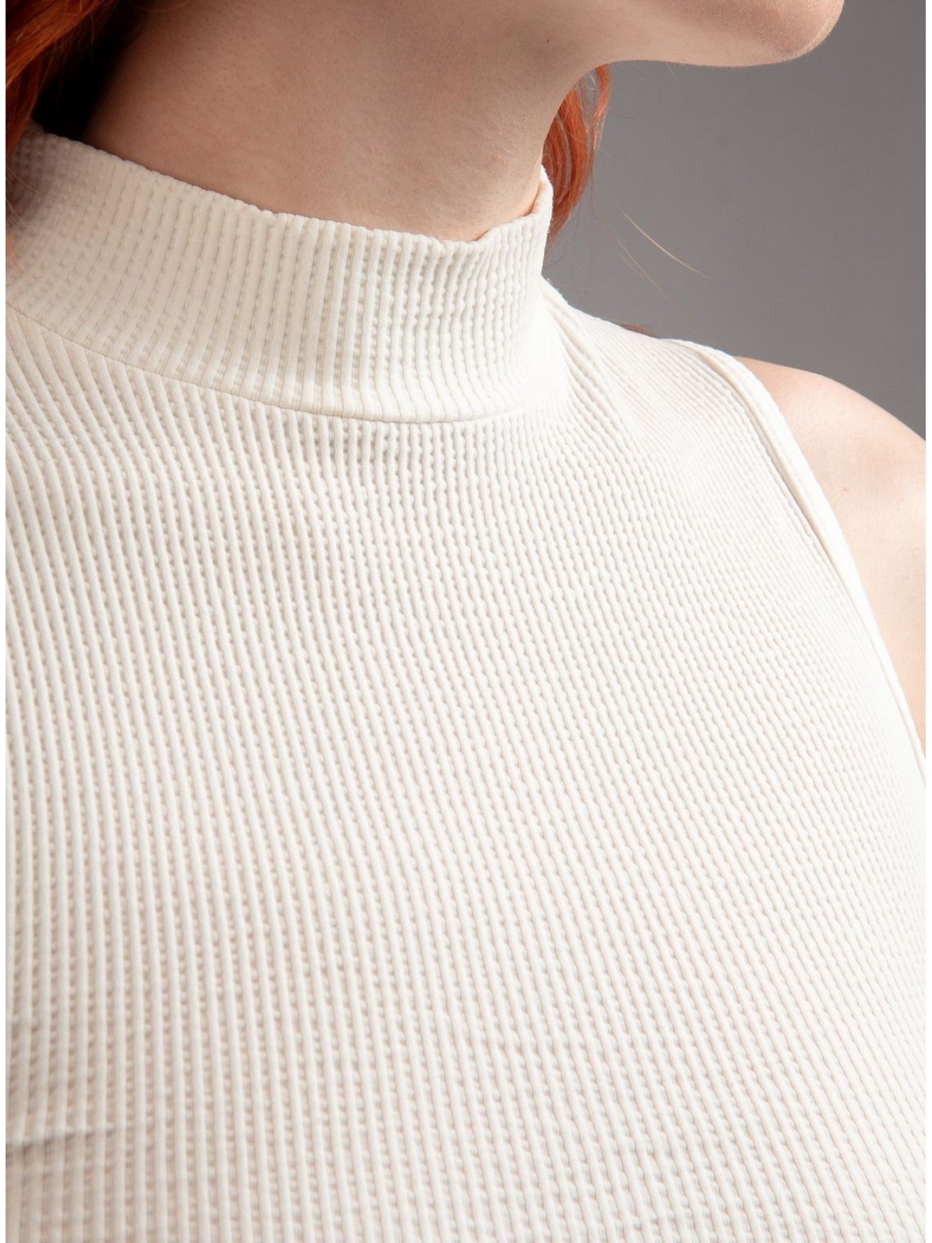 Майка-топ из полиамида белого цвета, в рубчик, с высоким горлом, без рукавов, укороченная, облегающая, на мягкой резинке.