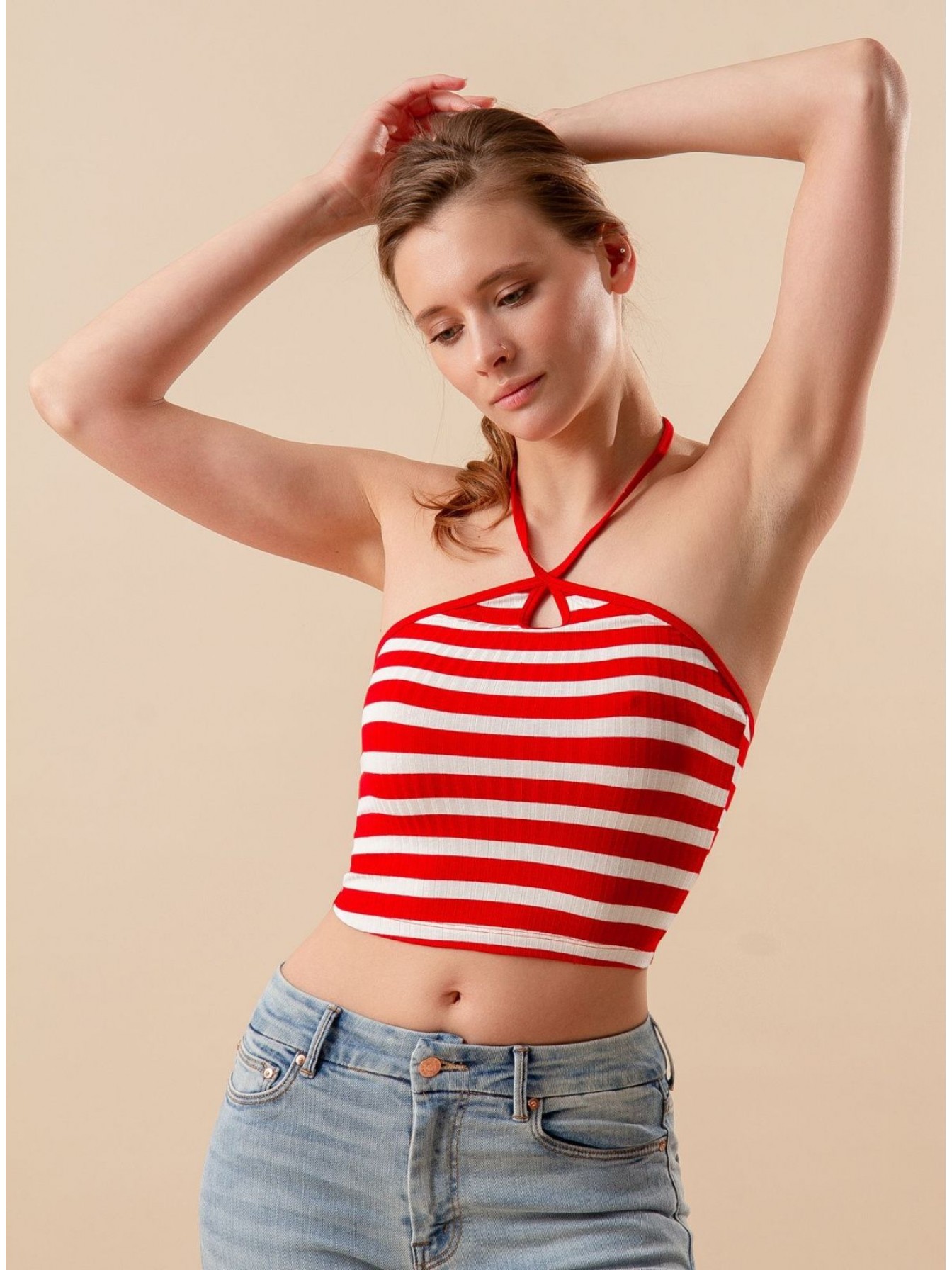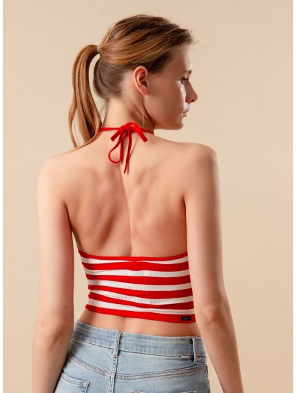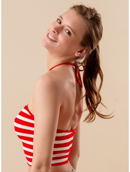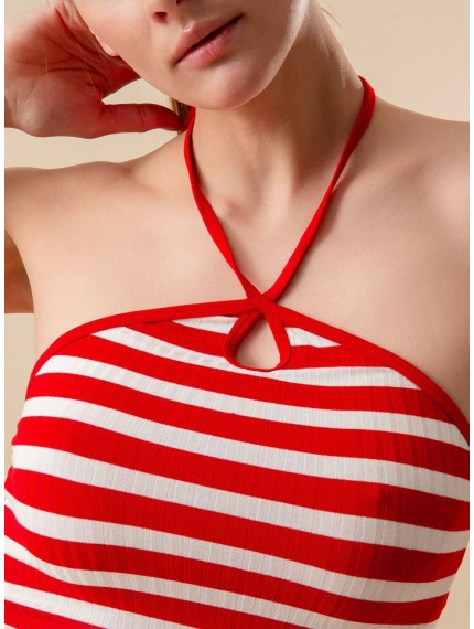 Топ выполнен из вискозы в тонкий рубчик, красно-белого цвета в полоску, без рукавов с регулируемыми завязками, укороченный.
