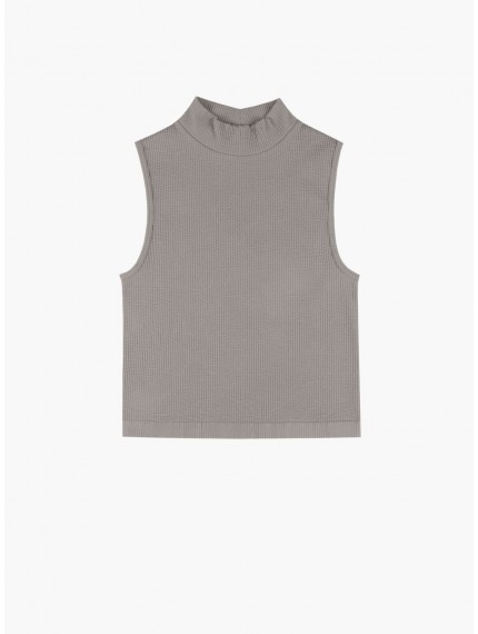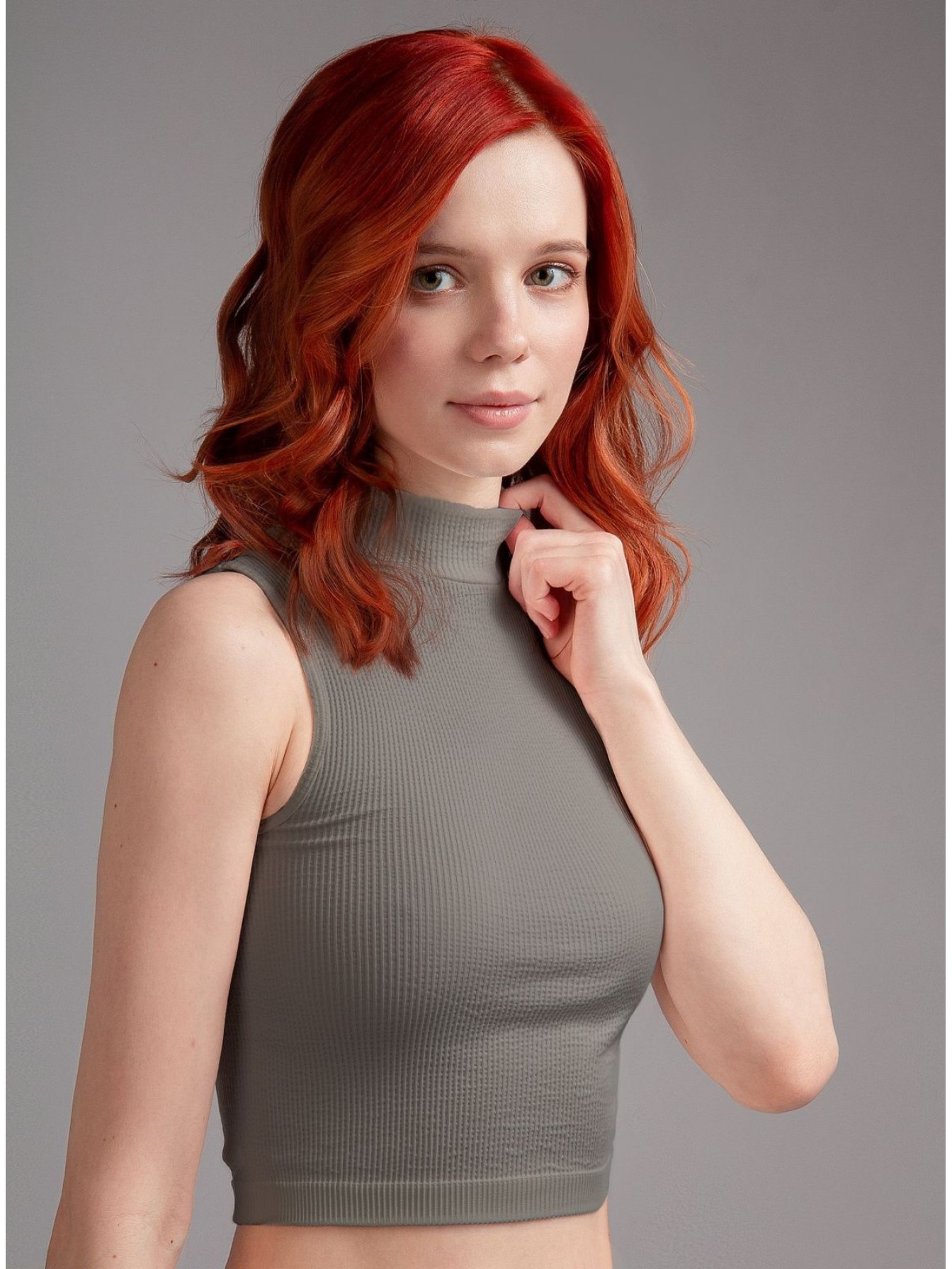Майка-топ выполнена из полиамида песочного цвета, в рубчик, с высоким горлом, без рукавов, укороченная, облегающая, на мягкой резинке.