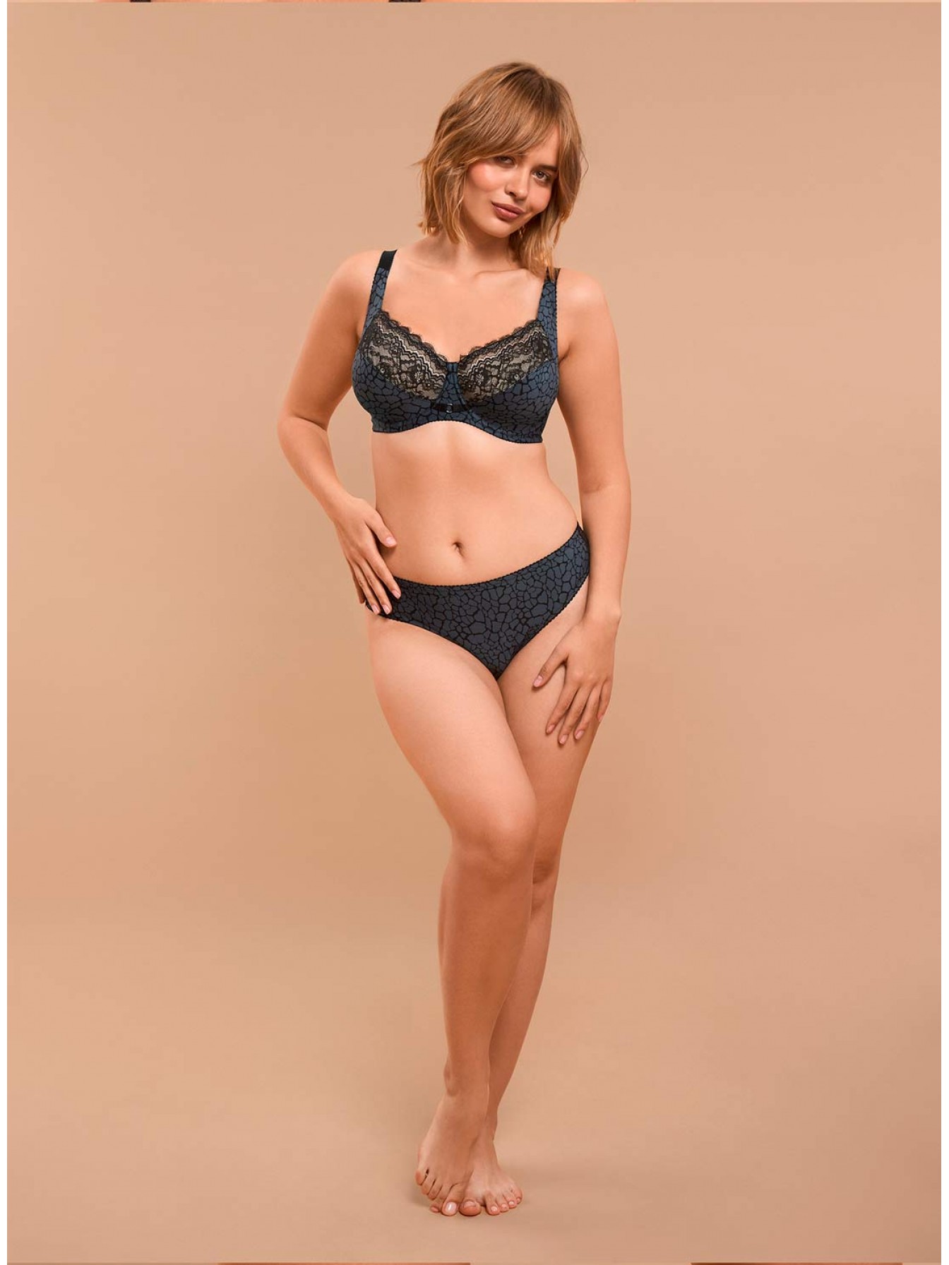 Бюстгальтер с мягкой чашкой на каркасах выполнен из принтованного полотна и эластичного кружева. Боковая поддержка чашки собирает грудь с боков и направляет ее к центру. Верхняя деталь чашки из кружева продублирована подкладкой из эластичной сетки, а нижняя – усилена подкладкой из трикотажного полотна. Боковые детали на подкладке из функционального полотна. Изделие дополнено декоративным элементом на центральной детали.