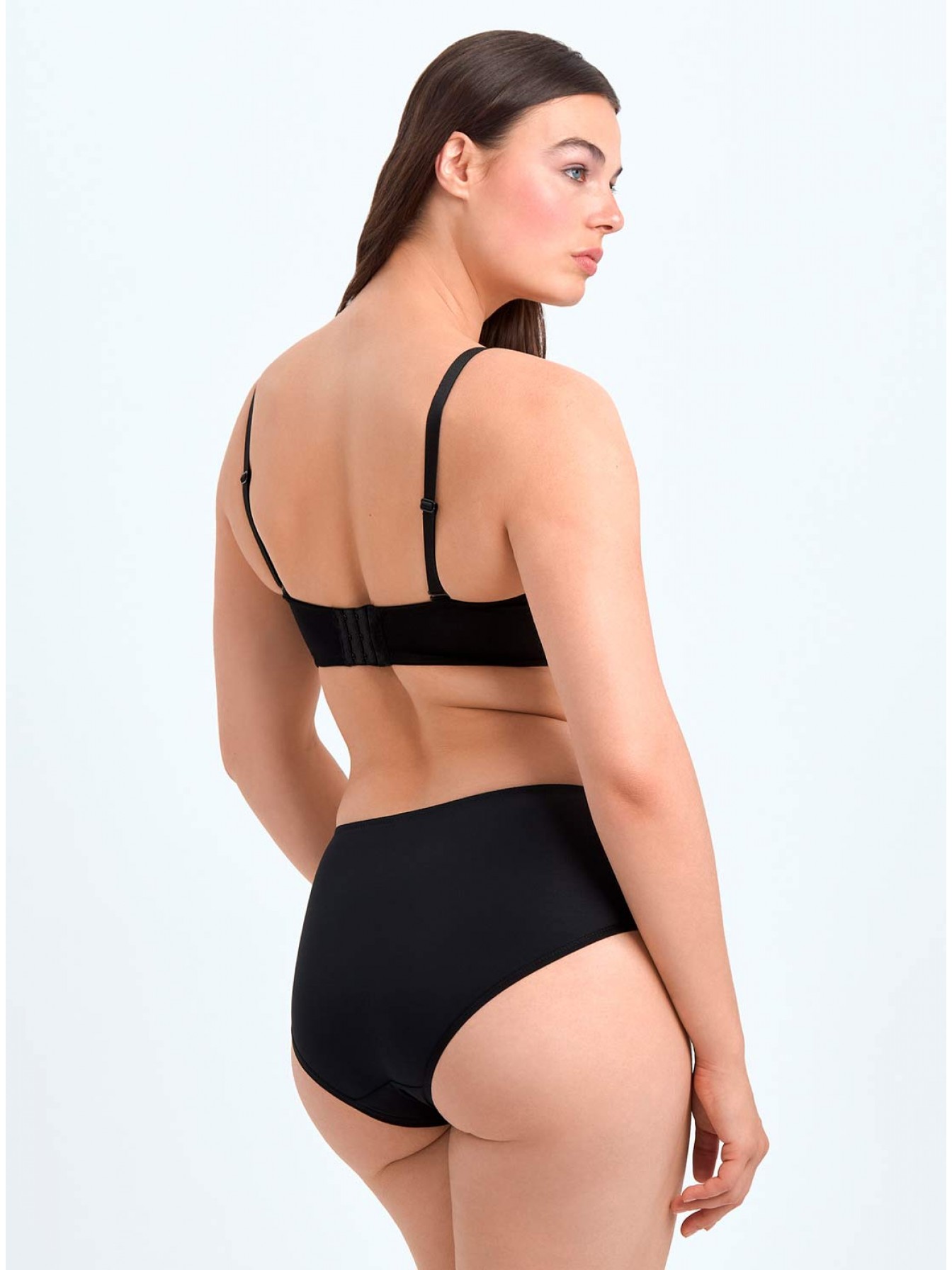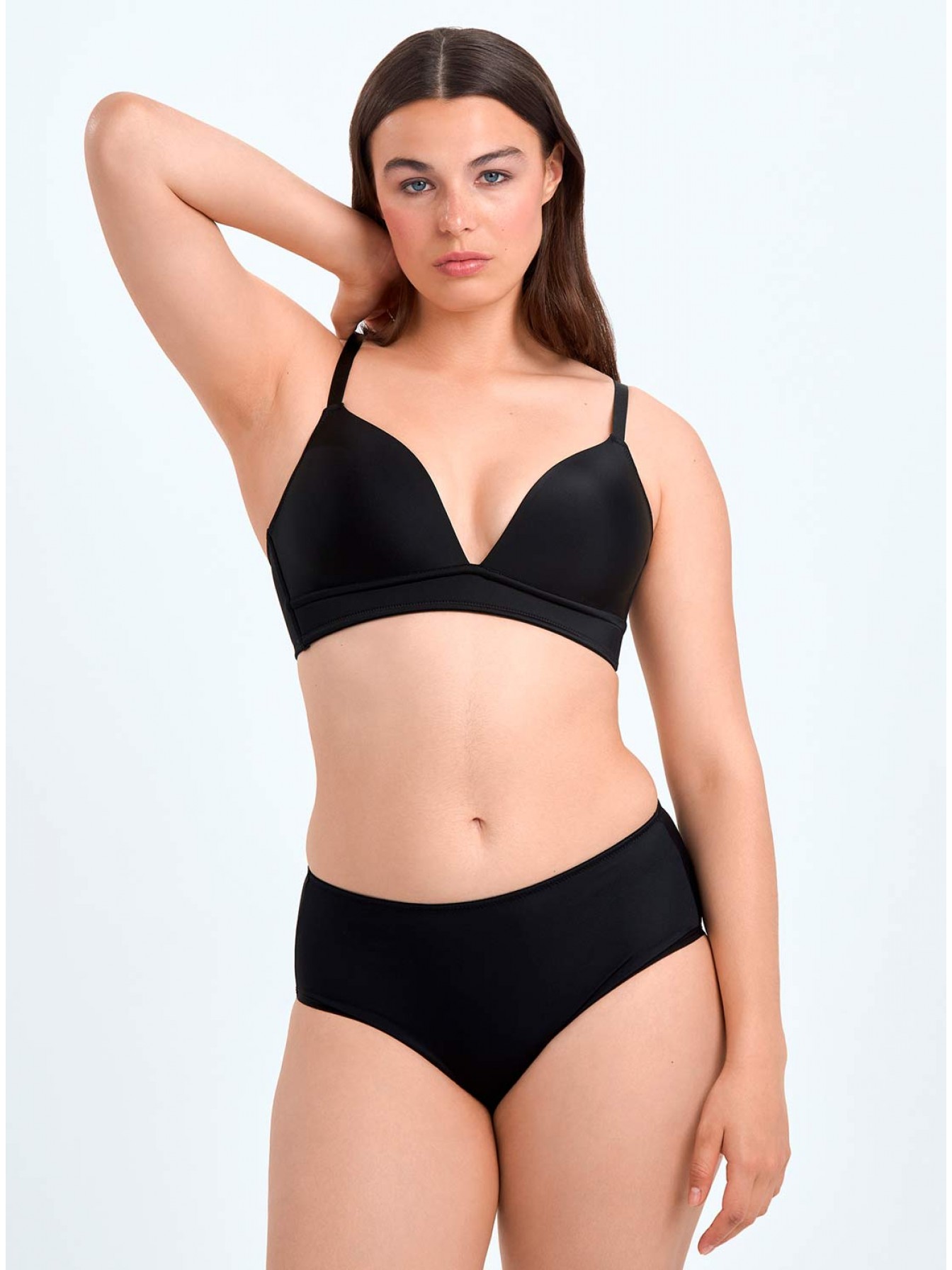 Бюстгальтер черного цвета, с формованной чашкой без каркасов. Выполнен из эластичного полотна.• Чашка без швов, выполненная из мягкого поролона, придает груди округлую форму • V-образный вырез красиво открывает линию декольте • Боковые детали на подкладке из функционального полотна усилены стержнями • Сзади бретели можно перестегнуть крест-накрест, еще эффектнее направив грудь к центру • Нижняя центральная деталь пояса усилена поролоном