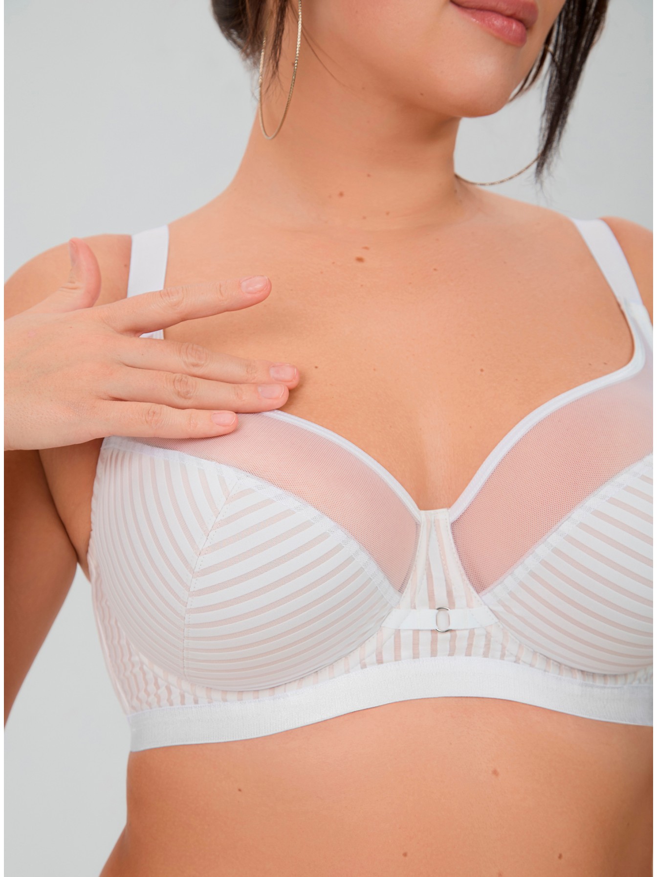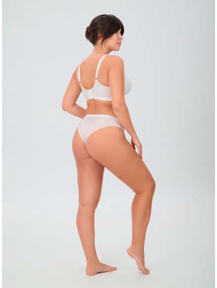Бюстгальтер с мягкой чашкой на каркасах выполнен из эластичного полотна с фактурным рисунком и неэластичной сетки • Крой чашки со смещенным относительно центра груди швом делает посадку более комфортной • Нижняя деталь чашки усилена подкладкой из трикотажного полотна • Верхняя деталь чашки из неэластичной полупрозрачной сетки • Боковые детали на подкладке из функционального полотна усилены стержнями • Изделие дополнено декоративными элементами с использованием серебряной фурнитуры Достойная базового гардероба линия «Бланж», благодаря своим строгим линиям и минималистичному дизайну, выступит идеальным вариантом как на каждый день, так и для особого случая.