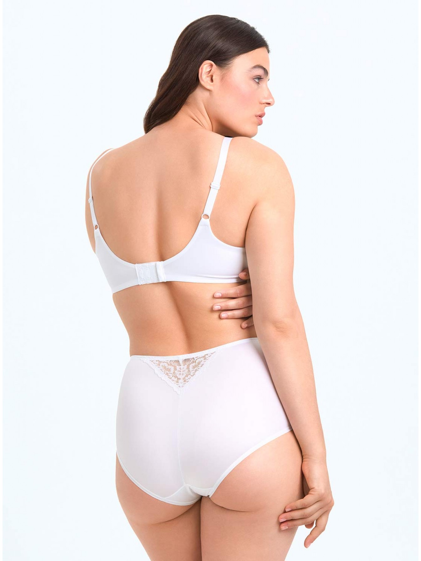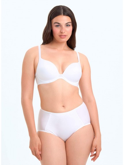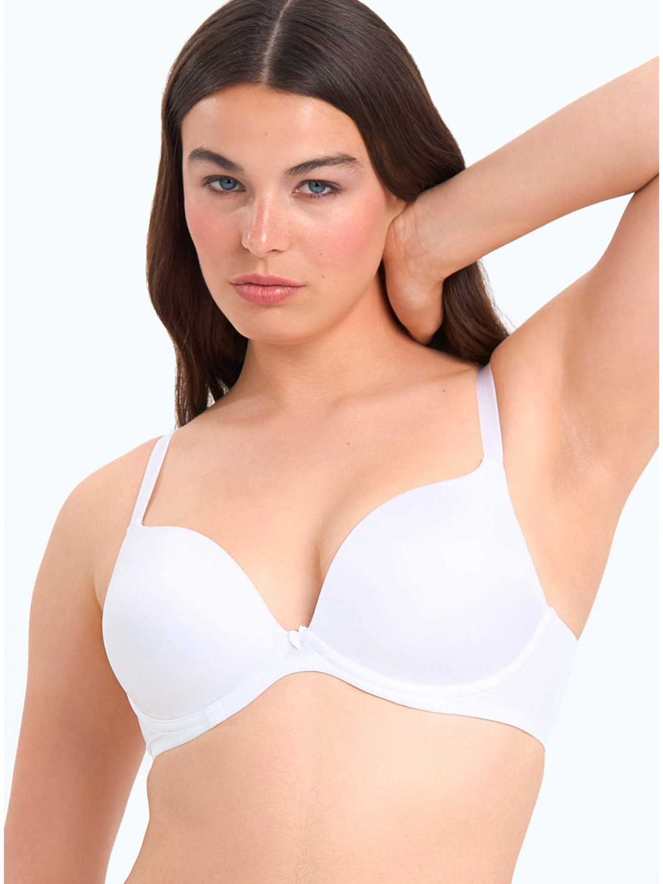 Бюстгальтер белого цвета с формованной чашкой на каркасах выполнен из эластичного полотна • Сильно выраженный эффект push-up • Чашка без швов, выполненная из мягкого поролона, придает груди округлую форму • Двухслойные боковые детали со скрытой внутри резиной добавляют комфорта • Заниженная центральная деталь подойдет для нарядов с глубоким декольте • Без боковых стержней • Спинка «маечного» типа • Округлая форма чашки отлично подойдет для обладательниц груди с большим диаметром прилегания к туловищу, а также для тех, у кого грудь направлена в стороны