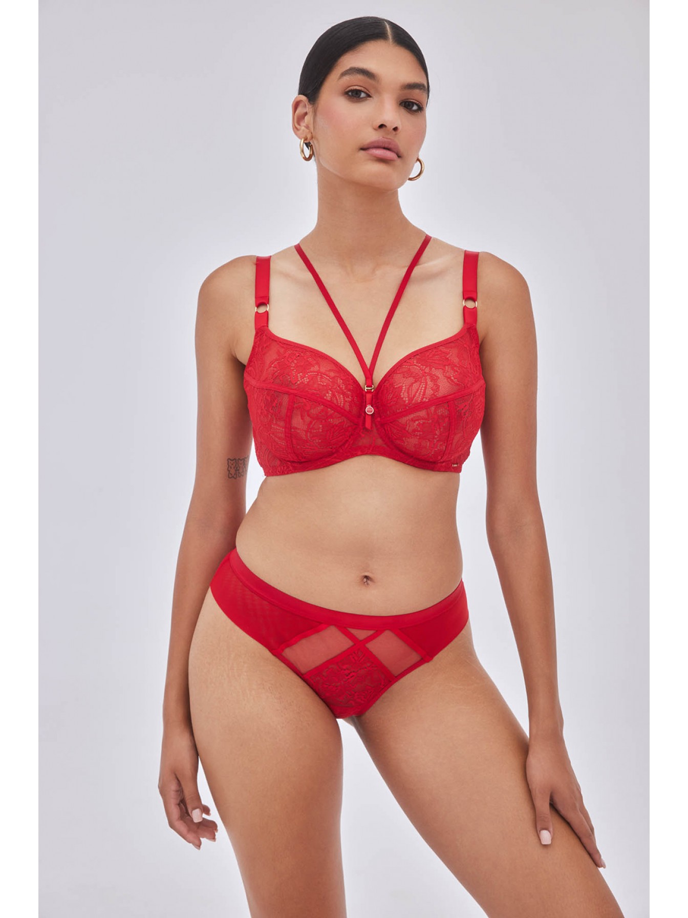 Кружевные трусики-бразилиана Chiara красного цвета. Выполнены из эластичной сетки и ажурного кружева. Ластовица хлопковая.
