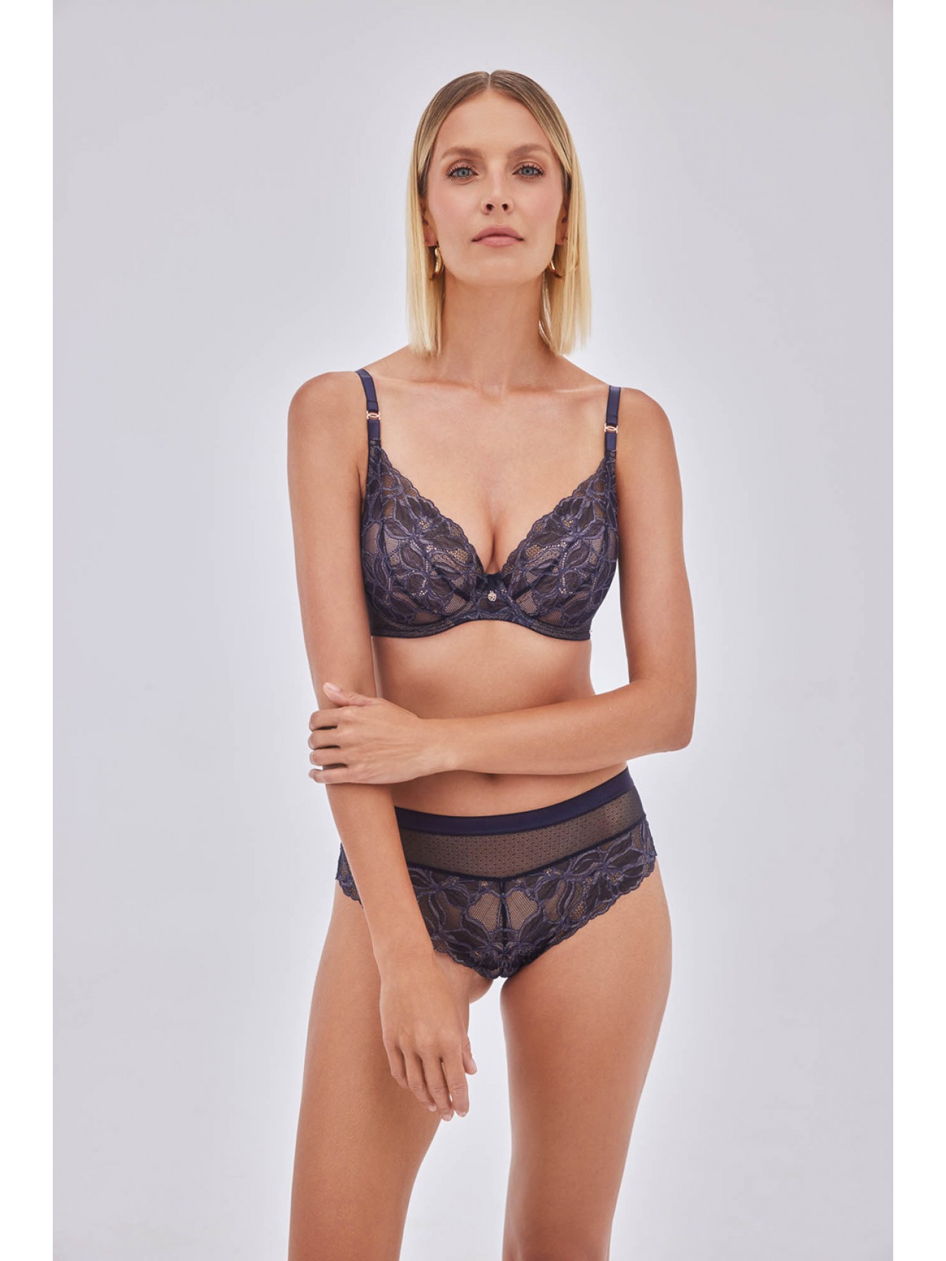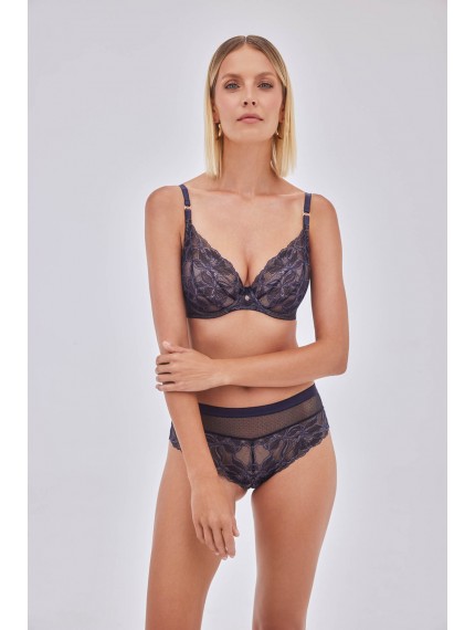 Кружевные трусики-бразилиана Glow синего цвета.Выполнены из эластичной сетки и ажурного кружева. Ластовица хлопковая.