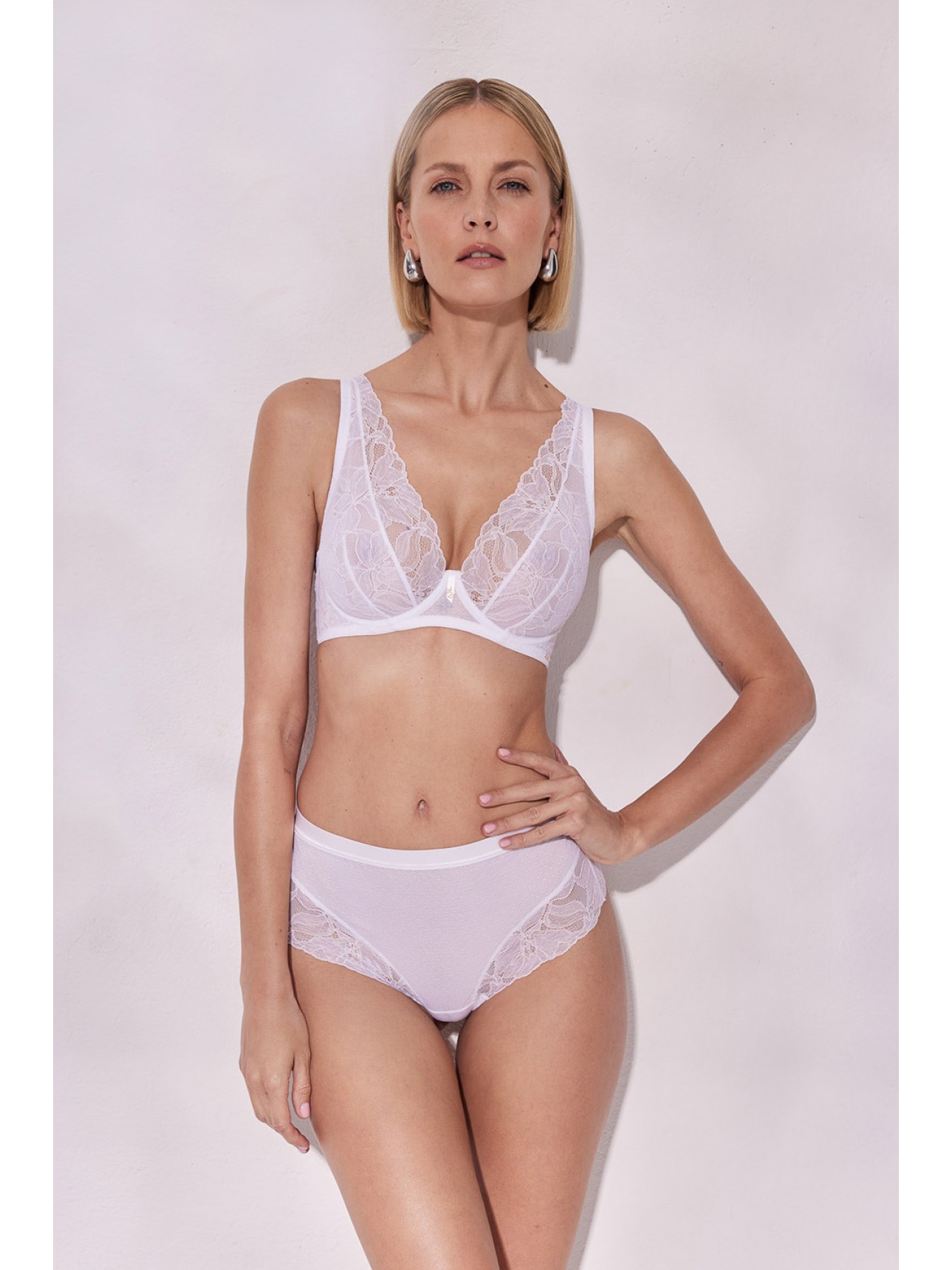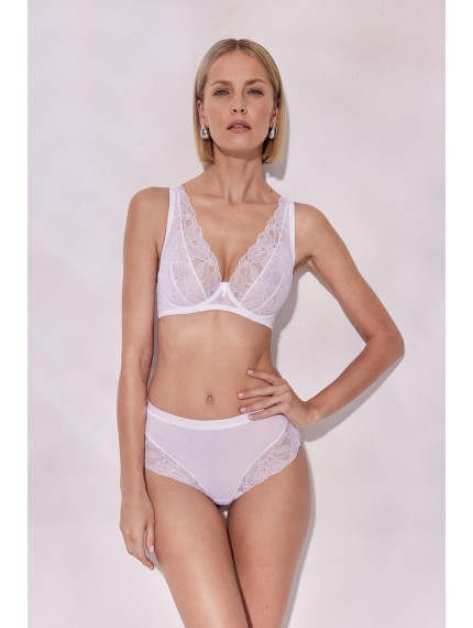 Высокие кружевные трусики-стринги Glow с завышенной посадкой и широким бочком. Сзади пикантный вырез украшен эластичными резинками и фурнитурой. Ластовица хлопковая.