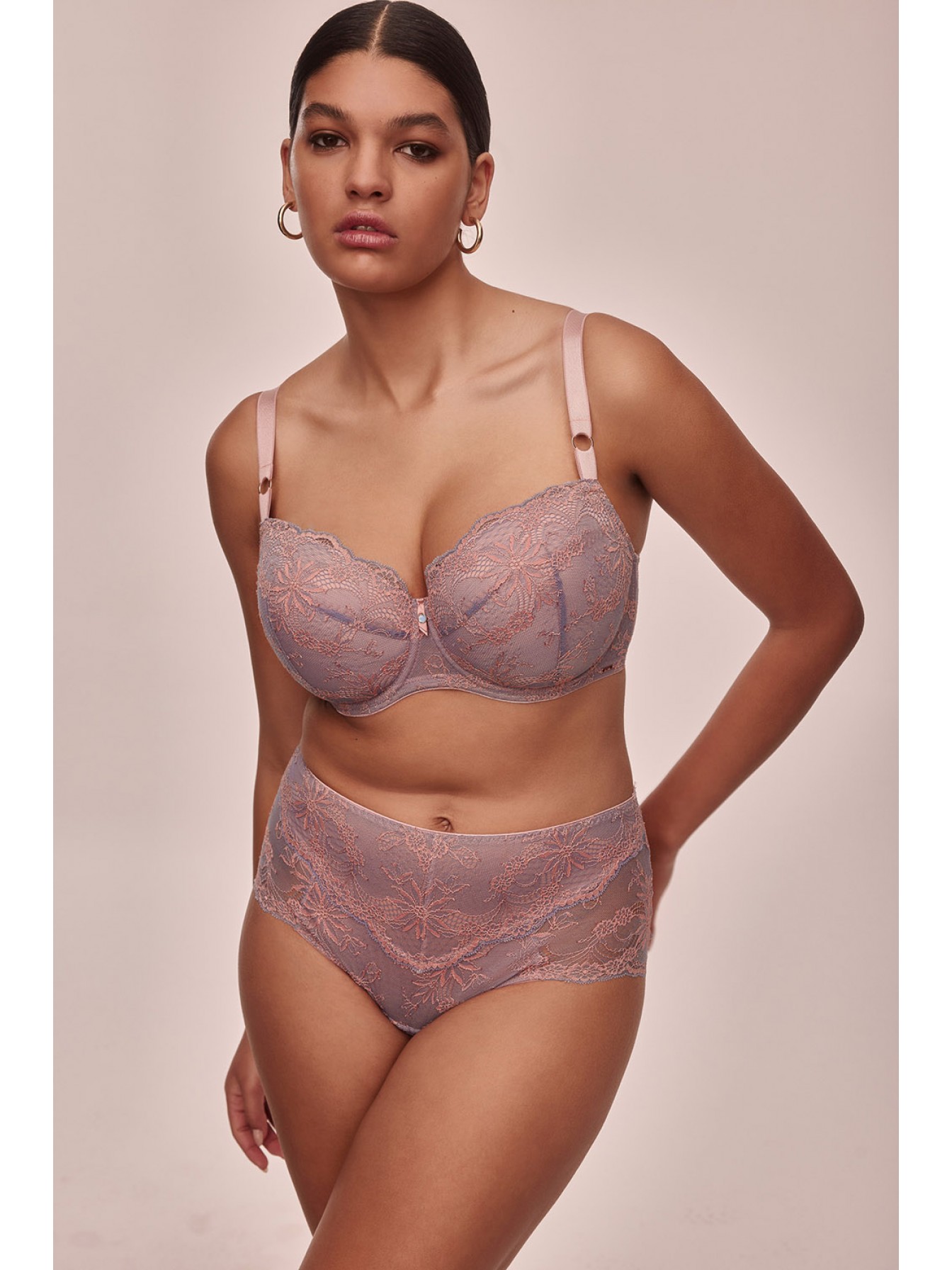 Кружевные трусики-слип Madera с завышенной посадкой и широким бочком. Выполнены из роскошного сиреневого кружева с цветочным узором. Ластовица хлопковая.