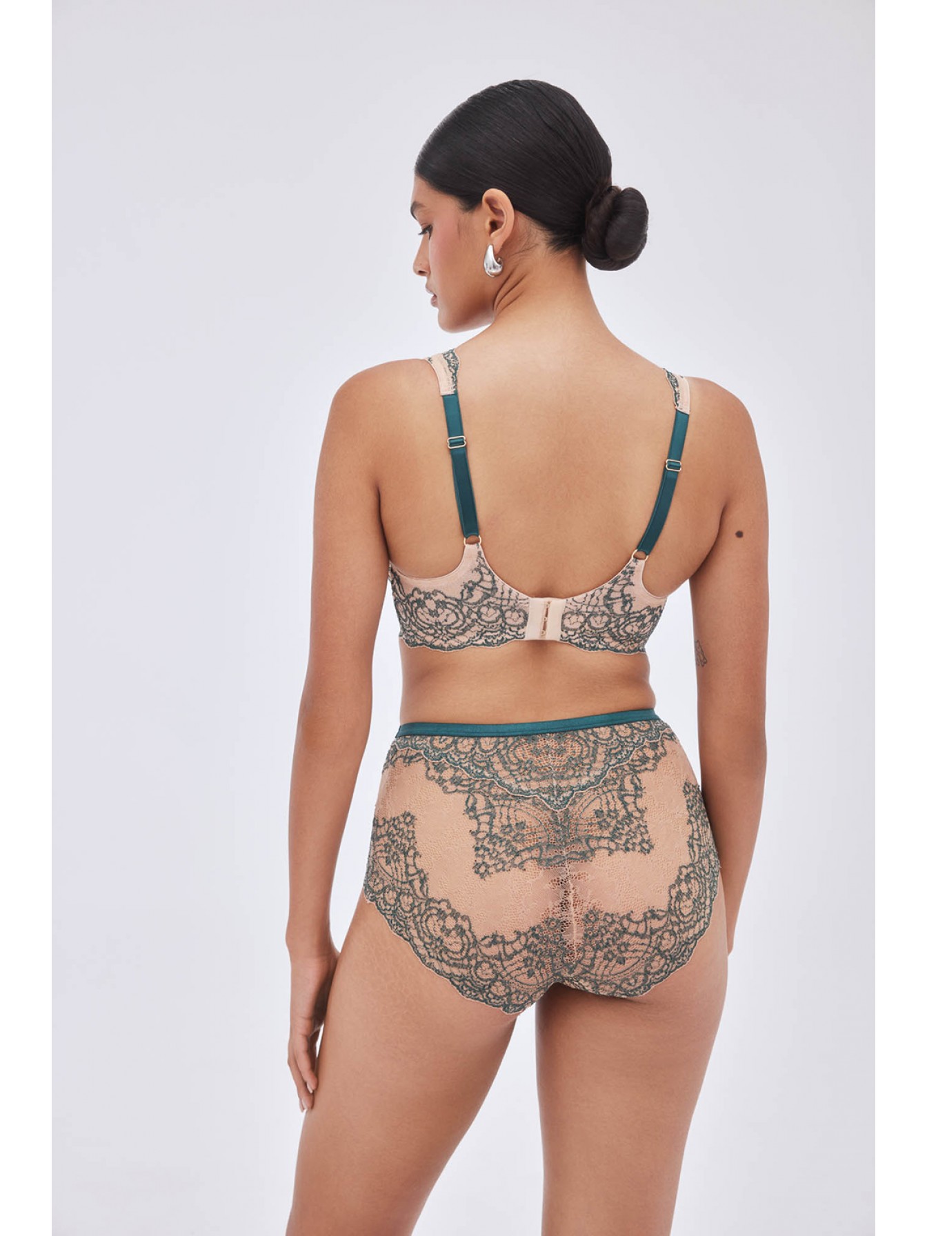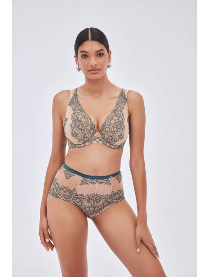 Высокие трусики-слип Splendore бежевого цвета с зеленым кружевом. Ластовица хлопковая.