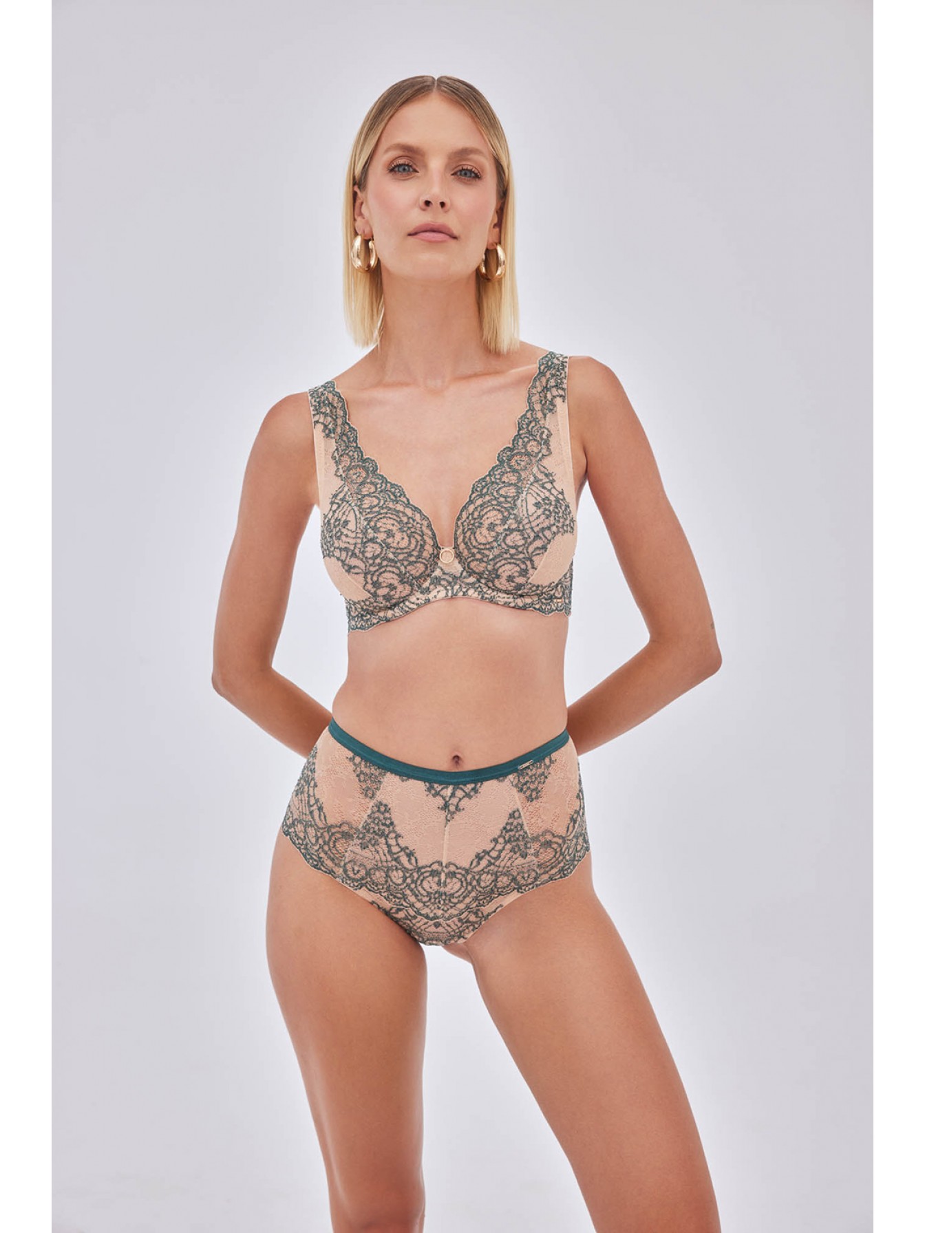 Высокие трусики-стринги Splendore бежевого цвета с зеленым кружевом. Ластовица хлопковая.