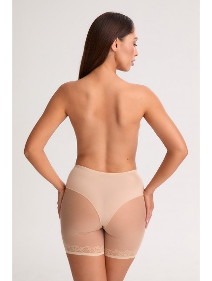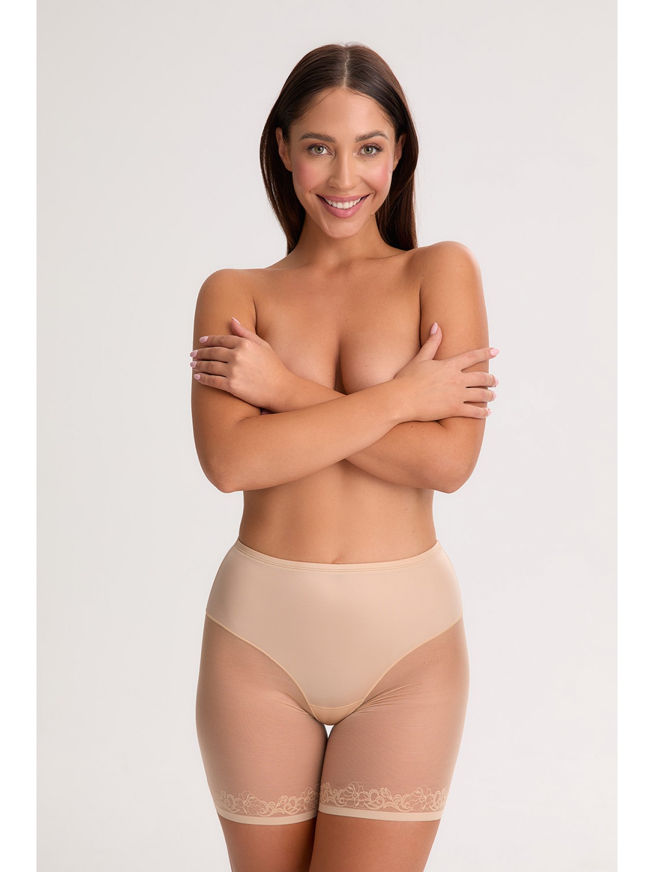 Бежевые трусы-шорты из линейки Comfort с высокой талией. Сочетание нежного тюля с плотным материалом обеспечивает не только комфорт, но и идеальную посадку на теле. Благодаря технологии плоских швов, они становятся практически невидимыми под одеждой.