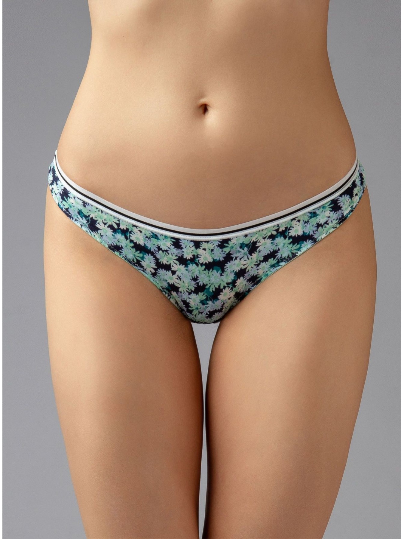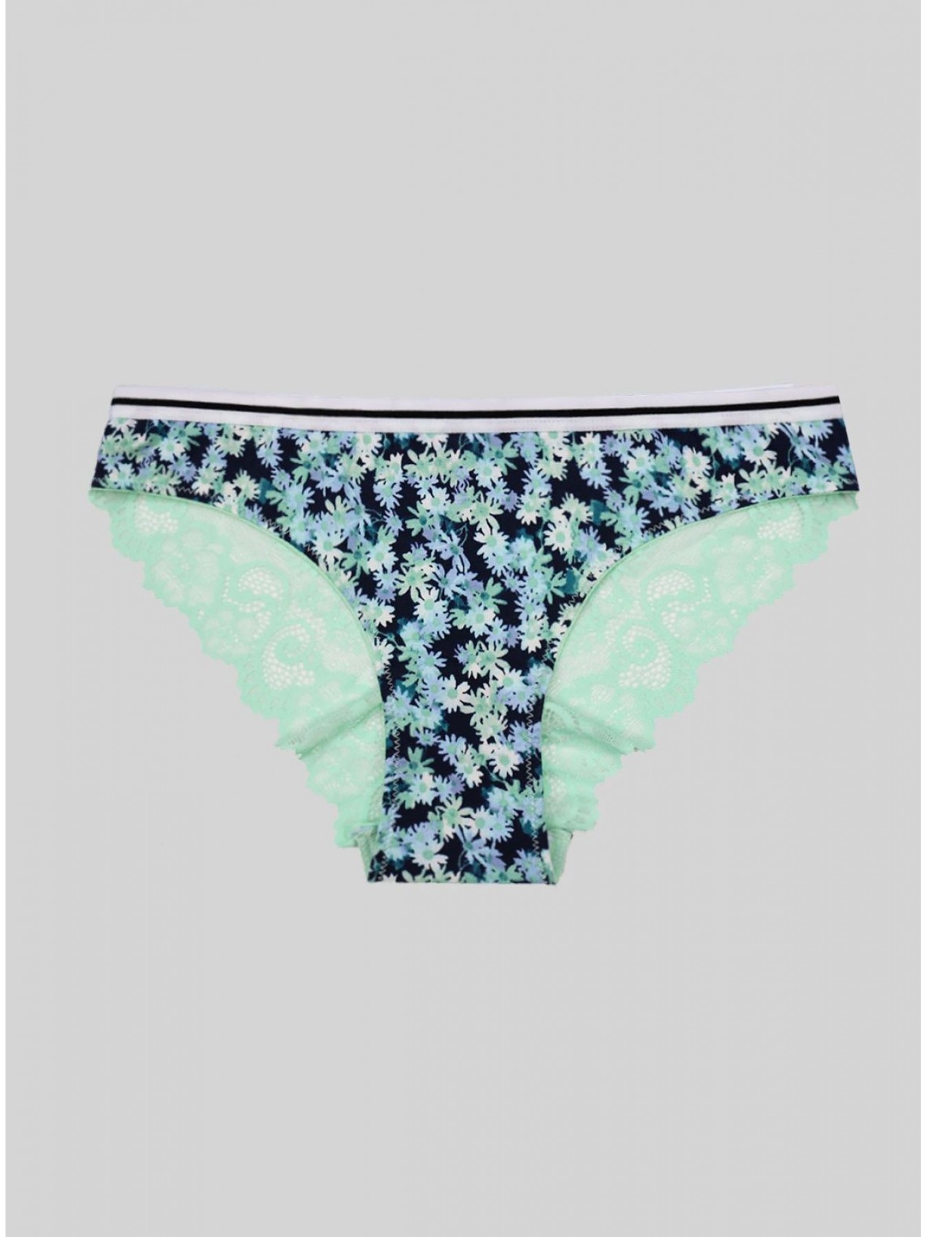 Женские трусы от торговой марки Indefini.Трусы-слипы из хлопка, черного цвета спереди, с цветочным принтом, с кружевной частью сзади зеленого цвета, средней посадки, на мягкой резинке.