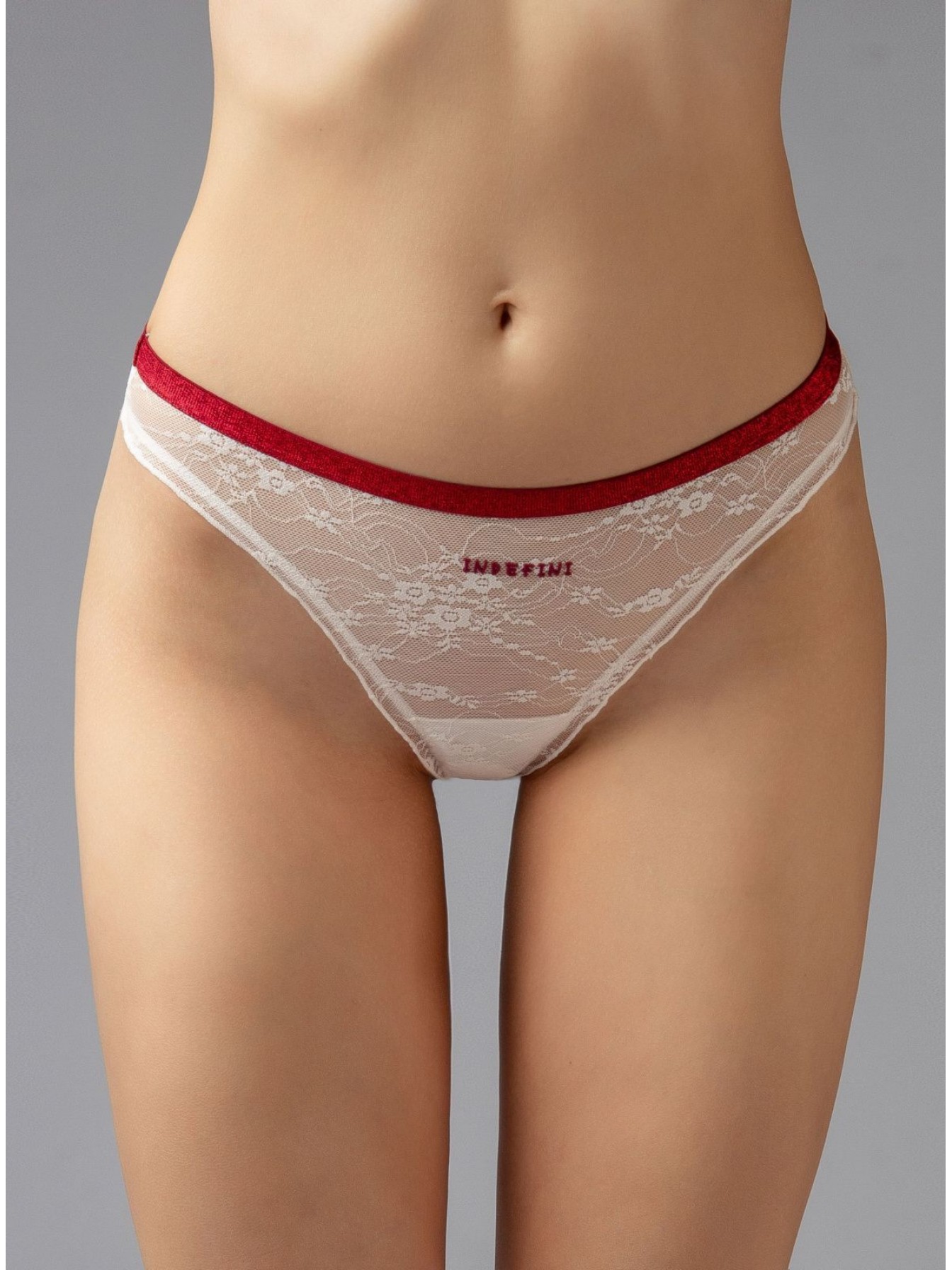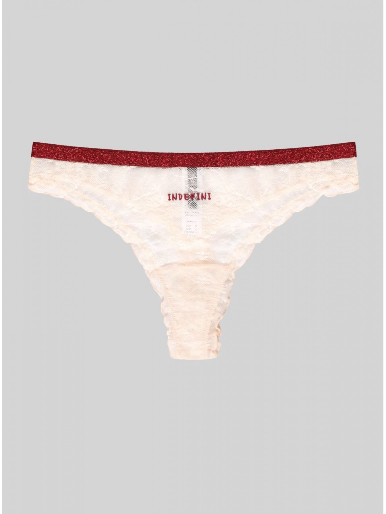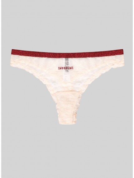 Женские трусы от торговой марки Индефини. Трусы-стринги из кружевной ткани, персикового цвета, с принтом, с кружевными вставками, на мягкой резинке, средней посадки.