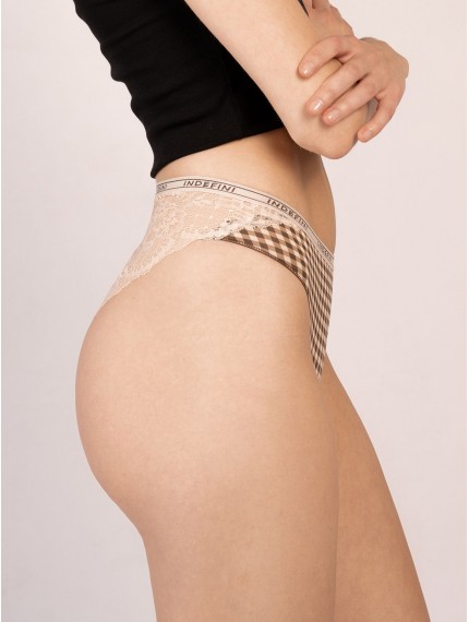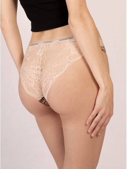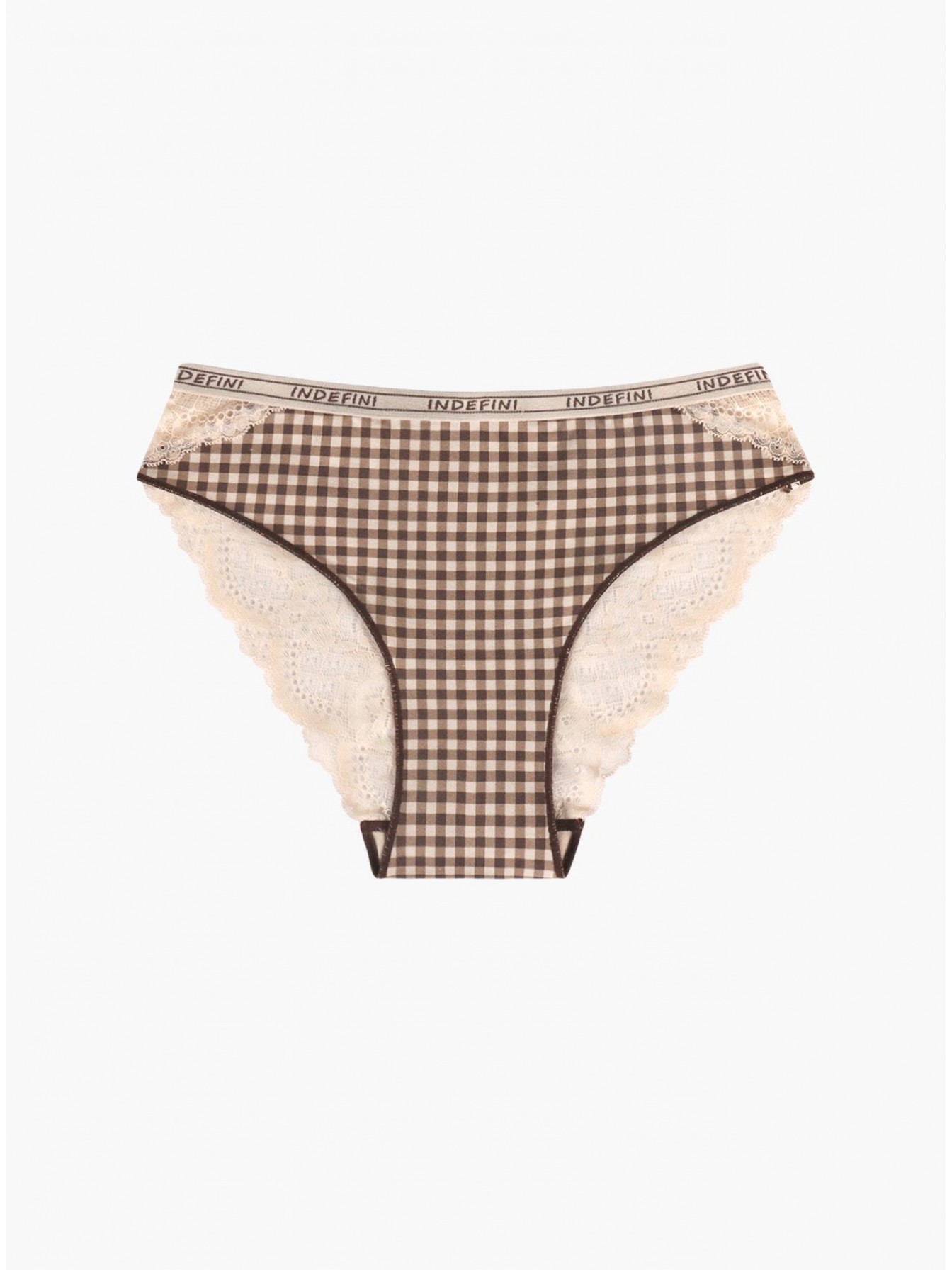 Трусы-слипы от Indefini выполнены из бамбука и хлопка, которые делают эти трусы гипоаллергенными и дышащими, что обеспечивает ощущение свежести и комфорта на протяжении всего дня.Бамбук в составе придаёт ткани мягкость и легкость, а хлопок добавляет изделию прочности и долговечности. Трусы средней посадки, на мягкой эластичной резинке, которая аккуратно фиксирует трусы на талии, не создавая давления и обеспечивая комфортную посадку.Оригинальный принт в бежево-коричневую клетку придаёт женским труса стильный и современный вид. Кружевные вставки по бокам и на задней части добавляют романтичности и женственности, делая эти трусы-слипы от Indefini не только удобными, но и визуально привлекательными.