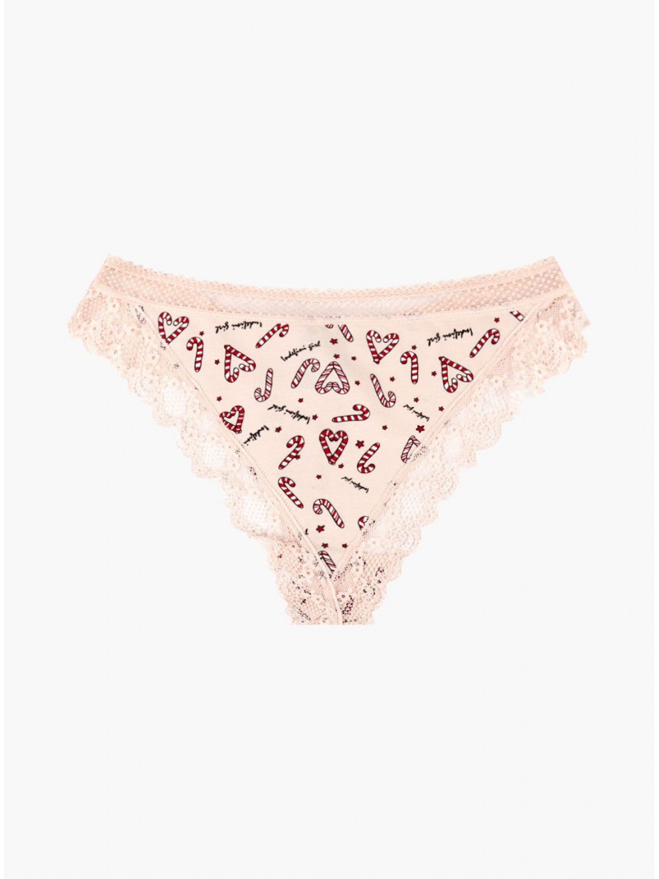 Женские трусы от торговой марки Индефини. Трусы-стринги из хлопка, бежевого цвета, с принтом, с кружевным обрамлением, на мягкой резинке, средней посадки.