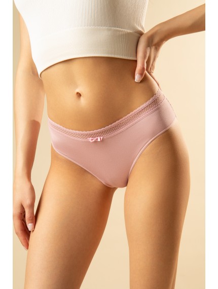 Трусы слипы женские 1365LUS бренда Indefini изготовлены из мягкой и дышащей смеси бамбука с эластаном.Выполнены в нежно-розовом цвете.Трусы средней посадки держатся на талии мягкой кружевной резинкой, украшенной изящным бантиком спереди.Задняя кружевная сторона изготовлена из полиамида с эластаном.На внутренней стороне трусов имеется хлопковая ластовица.