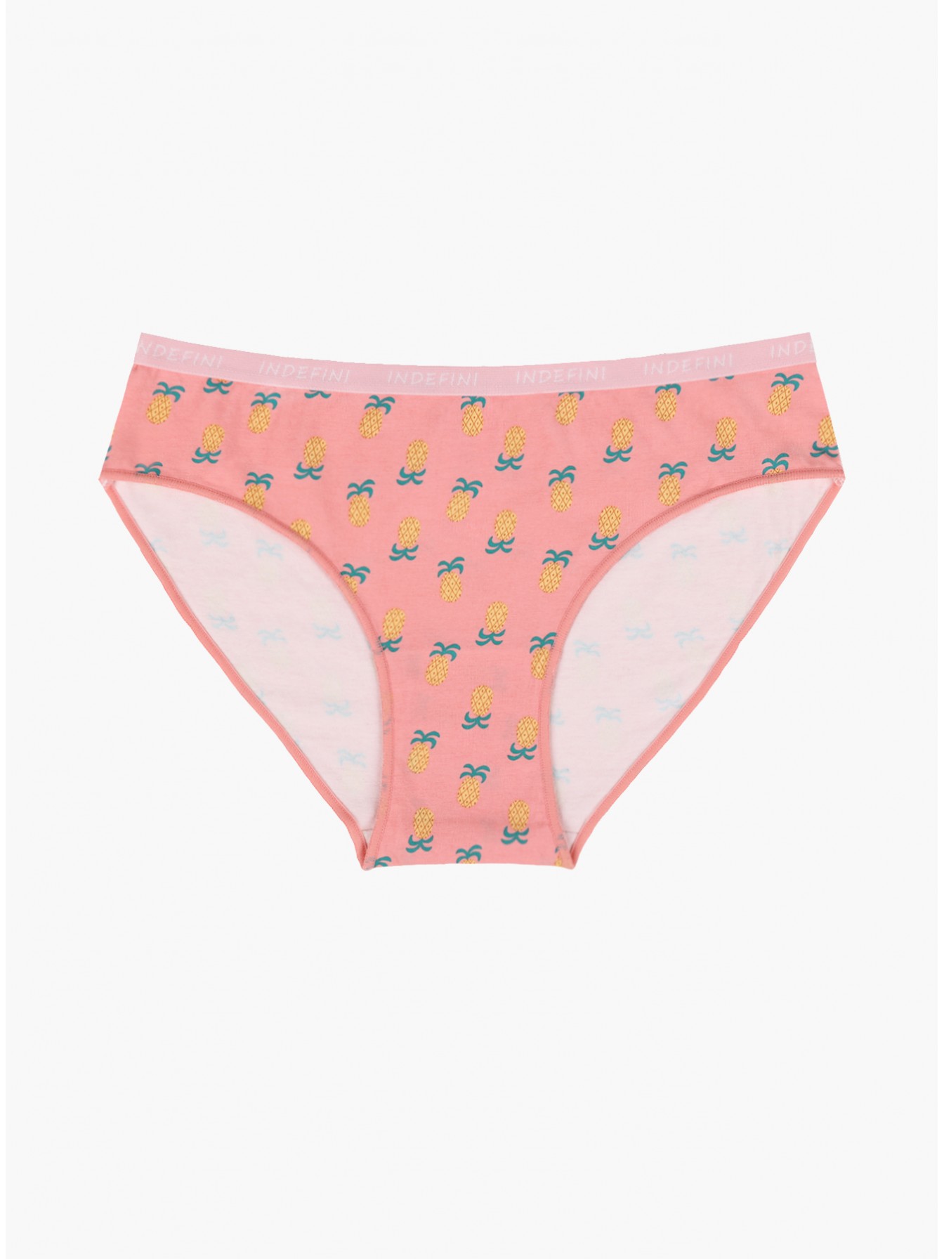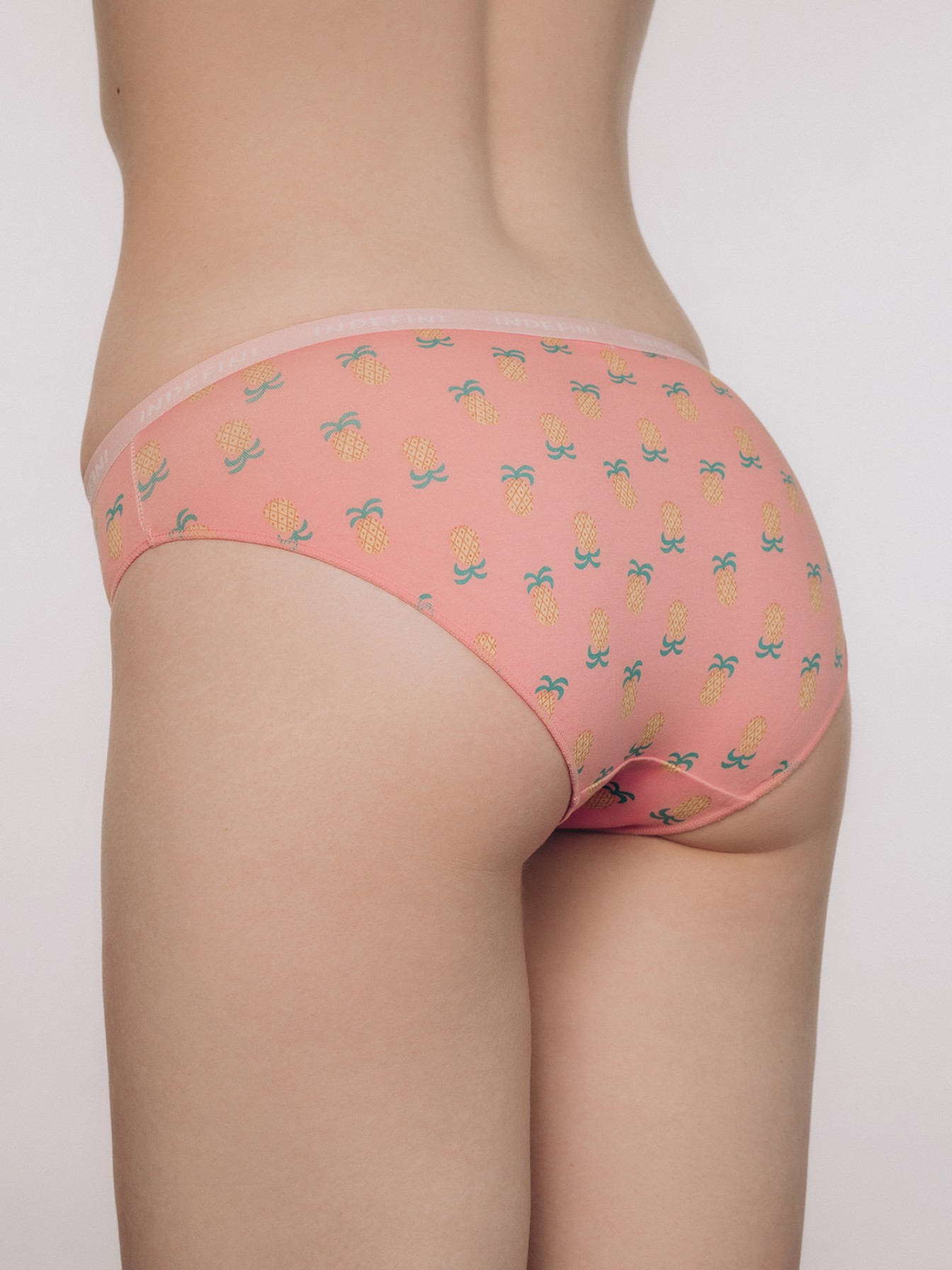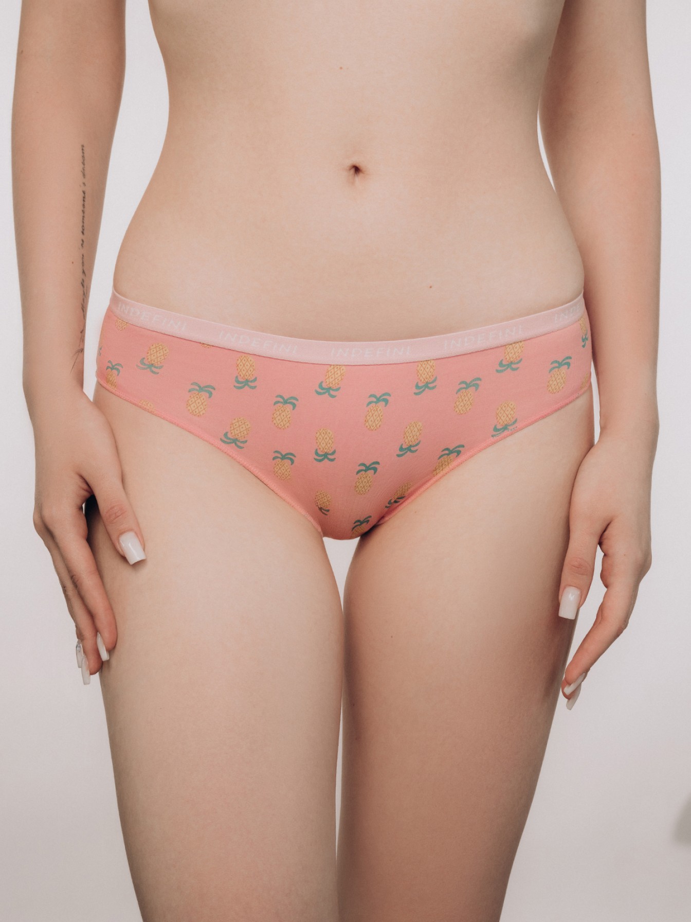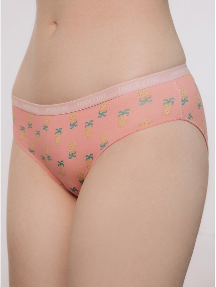 Трусы слипы женские 3116LUF бренда Indefini изготовлены из хлопка.Выполнены в розовом цвете.Трусы средней посадки держатся на талии мягкой резинкой, украшенной надписью «INDEFINI».На внутренней стороне трусов имеется хлопковая ластовица.На трусы нанесён принт с изображением ананасов.